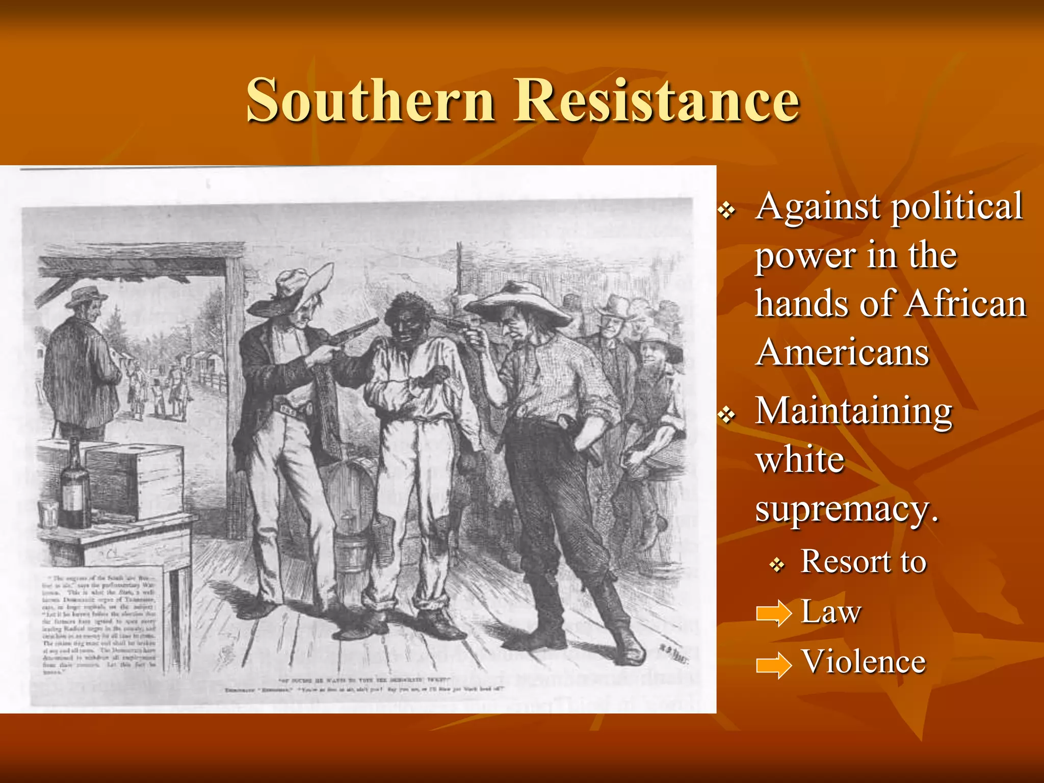 During the Reconstruction era, African Americans gained the crucial right to vote, which led to their involvement in politics, including the election of over 600 African American legislators. However, Southern states implemented black codes that restricted freedoms and maintained white supremacy through various oppressive laws and violent actions by groups such as the Ku Klux Klan. The black codes were eventually abolished by the 14th Amendment and Reconstruction policies, yet the struggle for civil rights continued with the emergence of Jim Crow laws.