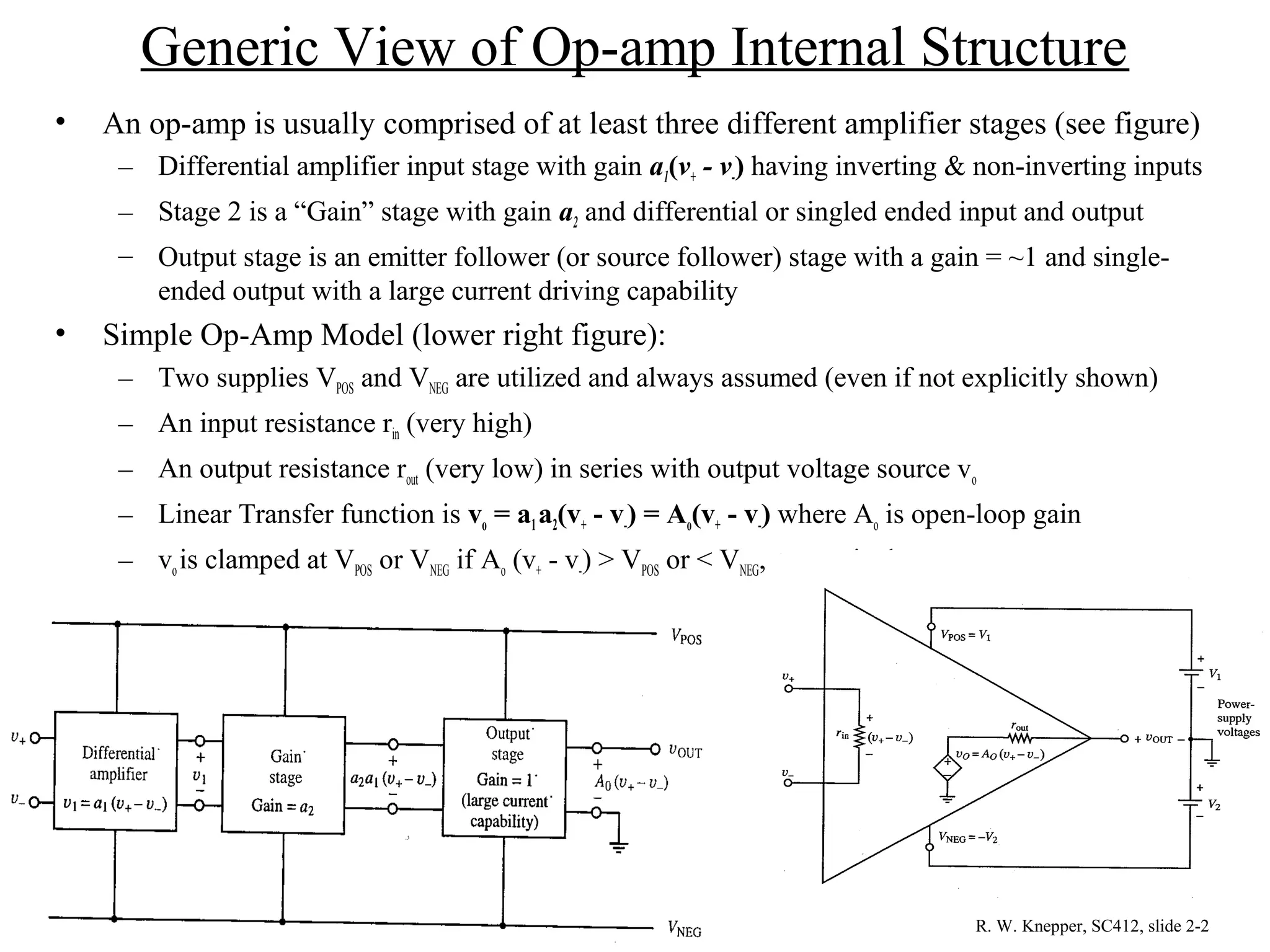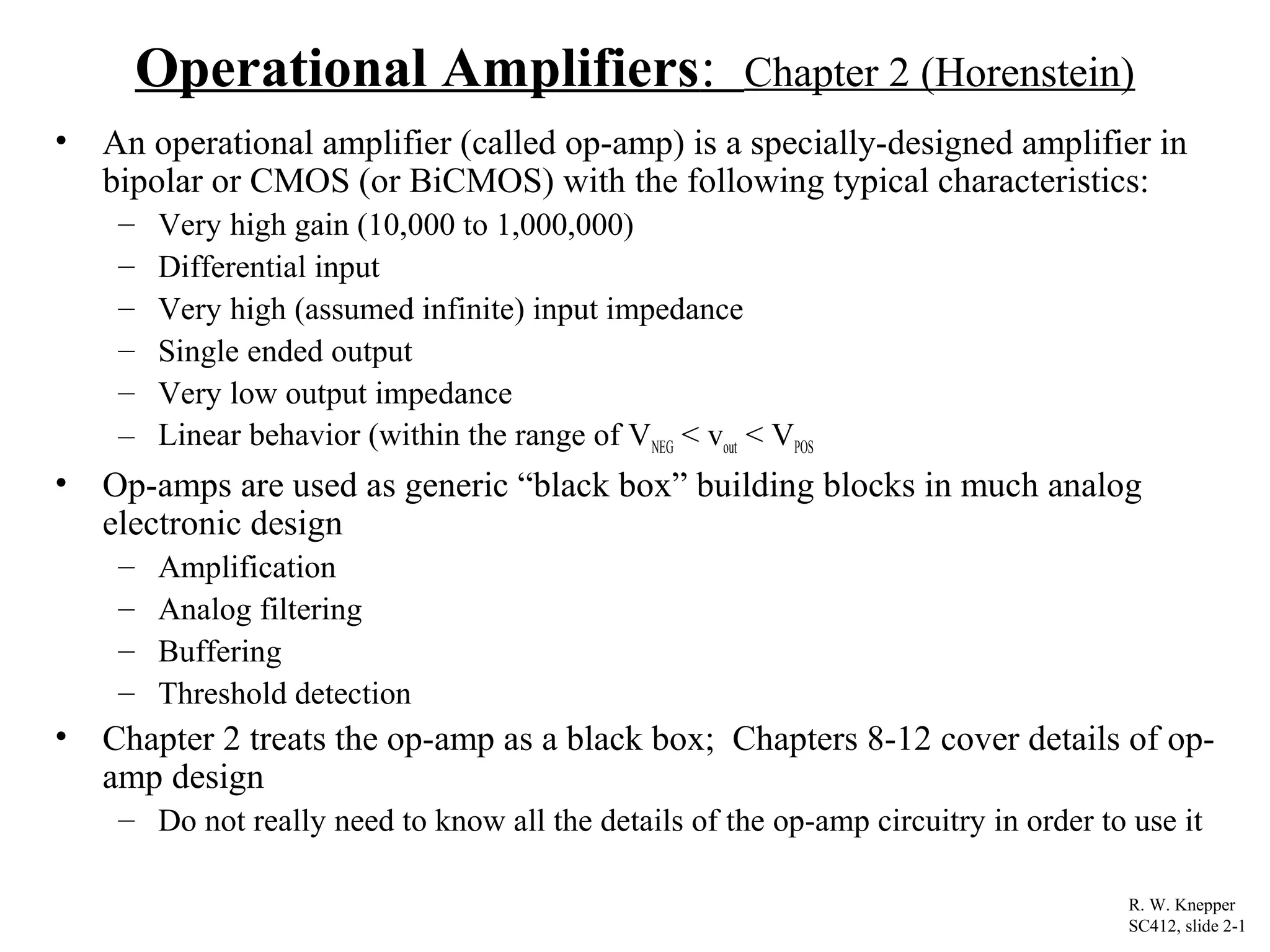 Operational amplifiers (op-amps) are high-gain amplifiers used as building blocks in analog electronic design. Key characteristics of op-amps include high input impedance, low output impedance, and very high voltage gain. Op-amps are often used in negative feedback configurations which allow the closed-loop gain to be determined by external resistors independently of the op-amp's open-loop gain. Common op-amp configurations include inverting, non-inverting, difference amplifier, integrator, and differentiator circuits.