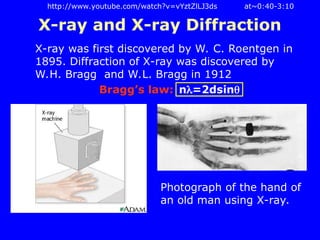 The document provides a comprehensive overview of X-ray diffraction (XRD), including the properties and generation of X-rays, Bragg’s law, and basics of crystallography. It details the principles behind X-ray production, diffraction patterns, and their applications in analyzing crystalline materials through mechanisms like constructive interference. Additionally, it discusses the significance of characteristics such as peak position, width, and intensity in determining lattice parameters and crystal structures.