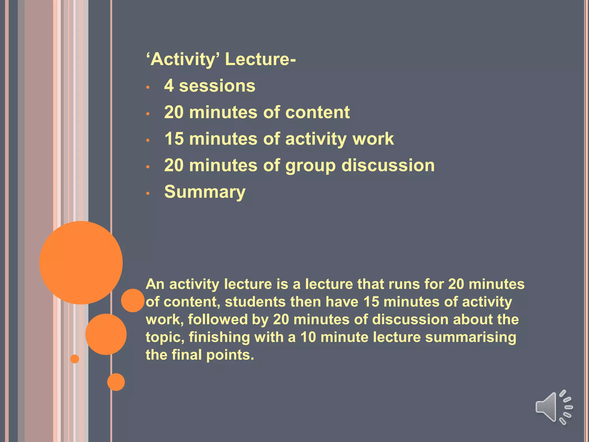 This 4 session lecture includes 20 minutes of content, followed by 15 minutes for students to do activity work related to the topic. Then there is a 20 minute group discussion about the topic. The lecture ends with a 10 minute summary of the key points.