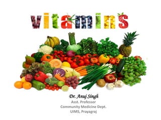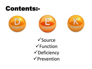Vitamins are organic compounds that are essential nutrients involved in important metabolic processes. They do not provide energy but support various functions. There are two types - fat soluble (A, D, E, K) which are stored in body and water soluble which circulate freely. Vitamins have specific roles like bone growth (D), antioxidant protection (E), blood clotting (K). Deficiencies can cause diseases while excess intake beyond recommended amounts can lead to toxicity in some cases.