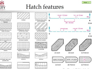 A section view shows a cutaway view of an object to reveal internal or hidden features. There are several types of section views, including full sections where the cut plane fully passes through the object, half sections where the cut plane cuts the object in half, and offset sections where the cut plane is not straight. Section lines at 45 degree angles are used to indicate cut areas and different types of materials. The location and angle of section lines is important to clearly show cut areas without being parallel to object lines.