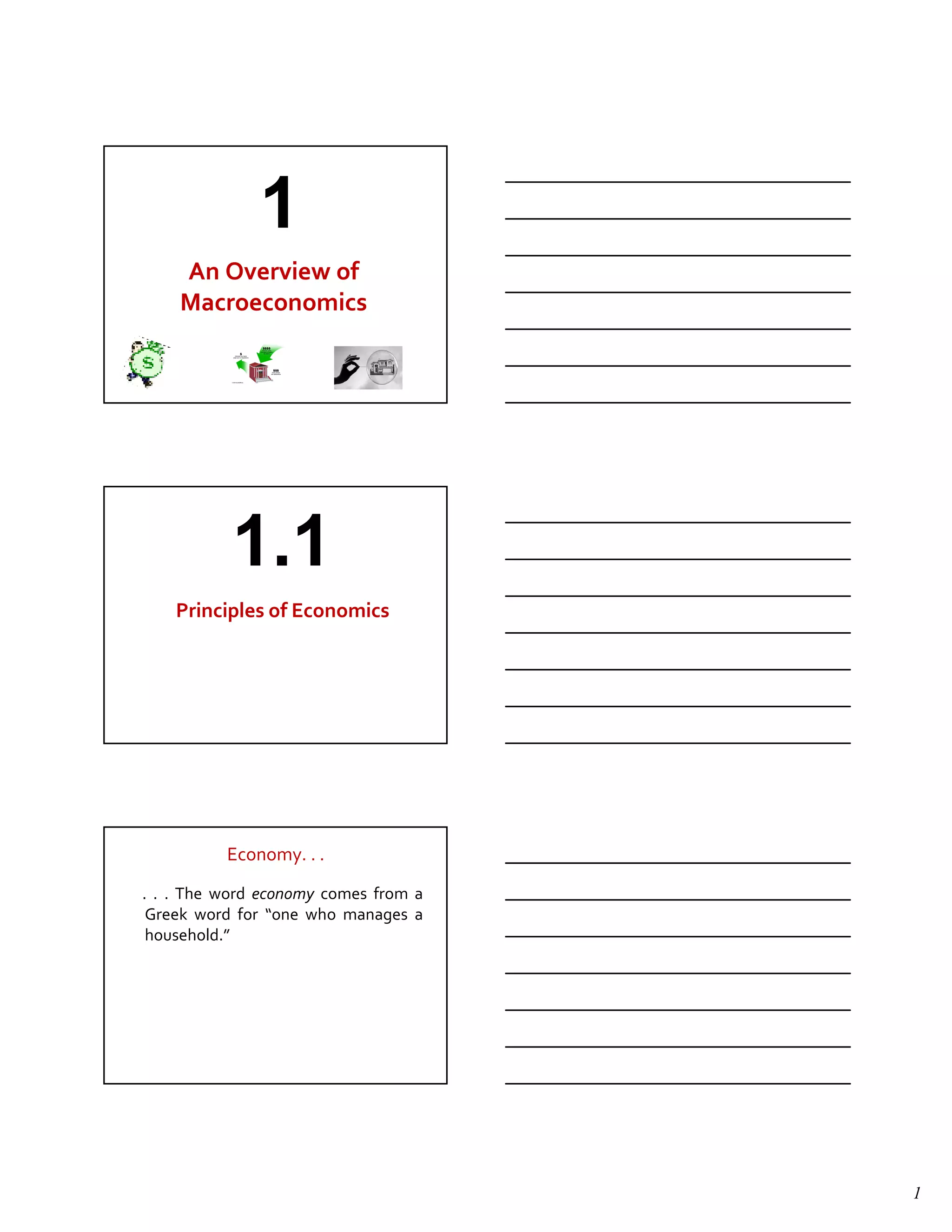 This document provides an overview of macroeconomics and the principles of economics. It discusses 10 key principles: (1) people face tradeoffs, (2) opportunity cost is the cost of something in terms of what you give up, (3) people think at the margin, (4) trade can make everyone better off, (5) markets are generally a good way to organize economic activity, (6) governments can improve market outcomes, (7) standard of living depends on production, (8) inflation results from too much money printing, (9) there is a short-run tradeoff between inflation and unemployment, and (10) rational people respond to incentives. It also introduces common economic models like the circular