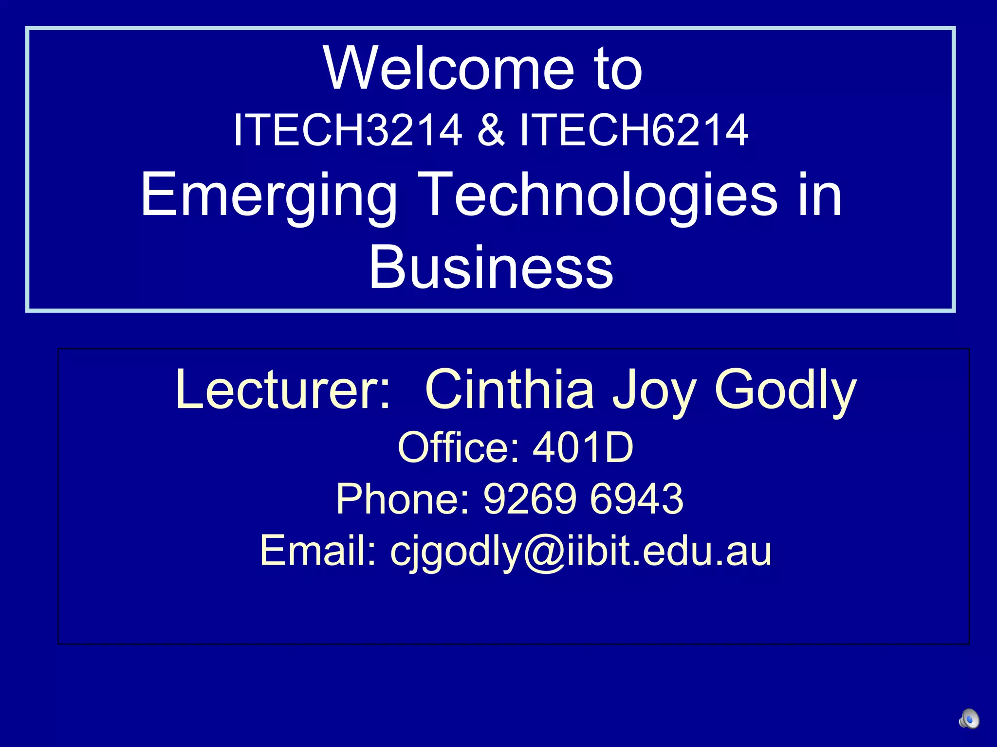 This document provides an overview and introduction to the course ITECH3214 & ITECH6214 Emerging Technologies in Business. It outlines the course details including the lecturer contact information, course layout, resources, objectives, topics, and definitions of key terms like e-business and emerging technologies. The goals for the first class are to discuss the history of IT and the internet, define important concepts, and provide examples of emerging technologies and their relevance to business.