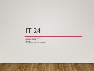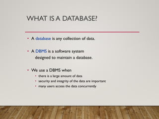 The document discusses fundamental database concepts including transactions. A transaction is defined as an indivisible unit of data processing that must satisfy the ACID properties - Atomicity, Consistency, Isolation, and Durability. Atomicity means all changes in a transaction are committed, or if any part fails, then the entire transaction fails. Consistency requires transactions leave the database in a valid state without violating constraints. Isolation ensures concurrent transactions do not interfere with each other. Durability makes committed transaction changes persistent and not lost even in the event of failures.