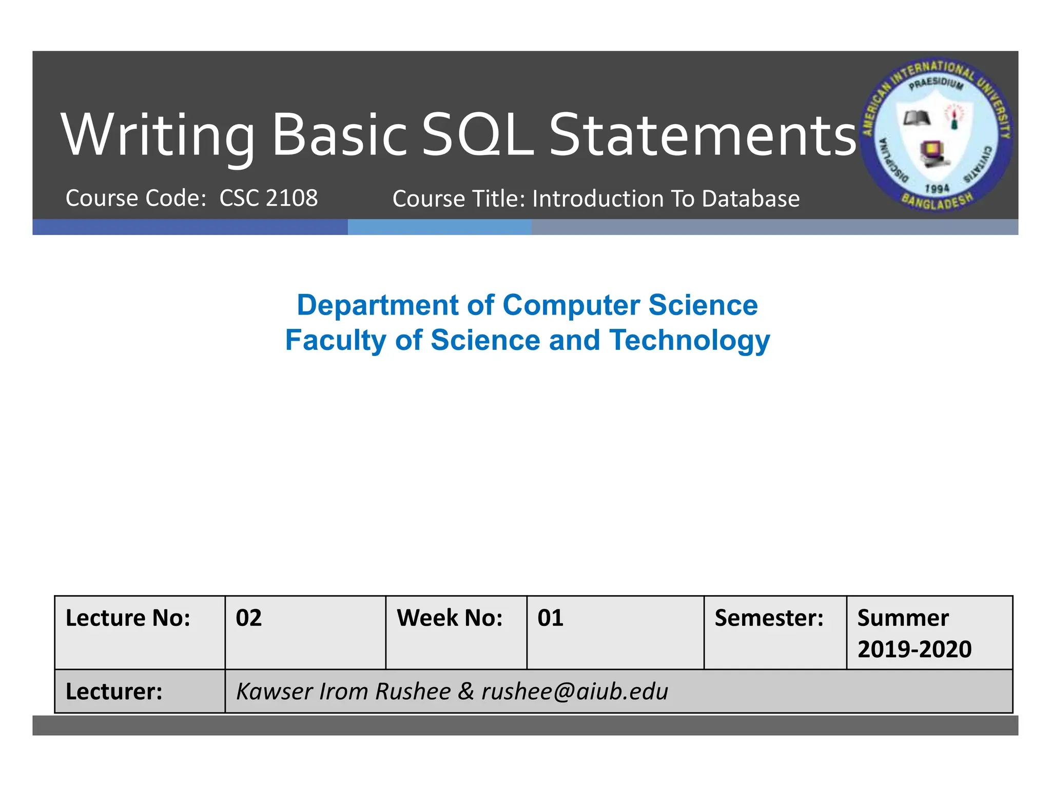 This document provides an overview of basic SQL statements. It discusses the capabilities of SQL SELECT statements including selection, projection, and joins. It then demonstrates how to write basic SELECT statements by selecting all columns or specific columns from a table. It also covers concepts like column aliases, arithmetic expressions, null values, concatenation operators, and eliminating duplicate rows. Finally, it distinguishes between SQL statements and SQL*Plus commands.