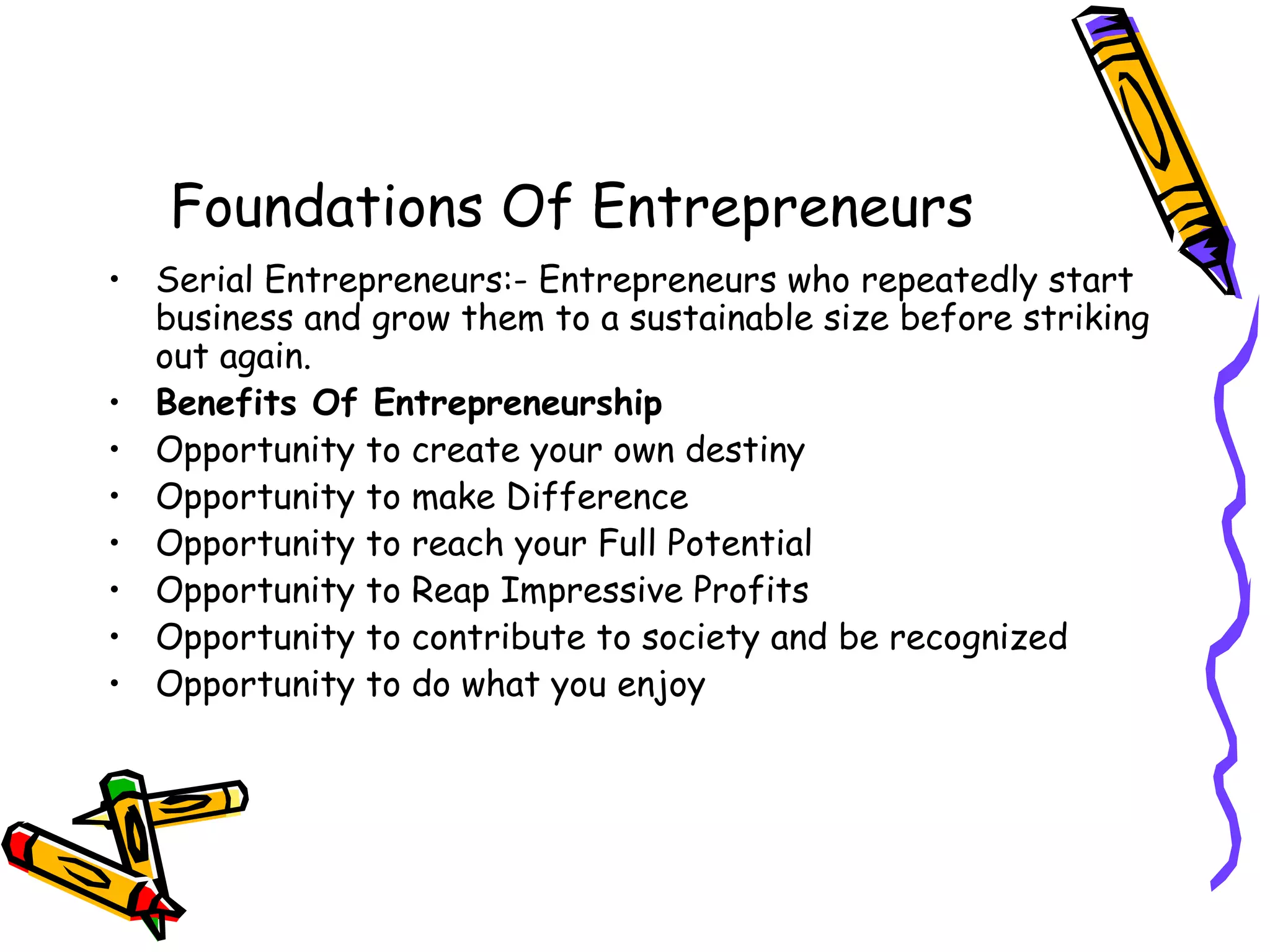 An entrepreneur is defined as someone who creates a new business while facing risks and uncertainties, with the goal of achieving profit and growth. Common traits of entrepreneurs include a desire for responsibility, moderate risk-taking, confidence, and a future orientation. Some benefits of entrepreneurship include creating your own destiny and reaching your full potential, while potential drawbacks include uncertainty of income and risk of losing investments. Forces driving increased entrepreneurship include entrepreneurial education, demographic trends of those aged 25-44 pursuing opportunities, and technological advancements lowering barriers to entry.