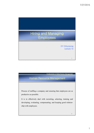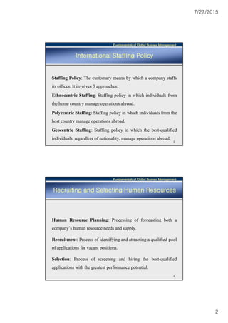 This document discusses key aspects of human resource management for global companies. It covers international staffing policies including ethnocentric, polycentric, and geocentric approaches. It also discusses human resource planning, recruiting, selecting, training, compensating employees internationally, dealing with culture shock, and maintaining labor-management relations abroad. The overall focus is on effectively managing the human resource process for companies operating globally.