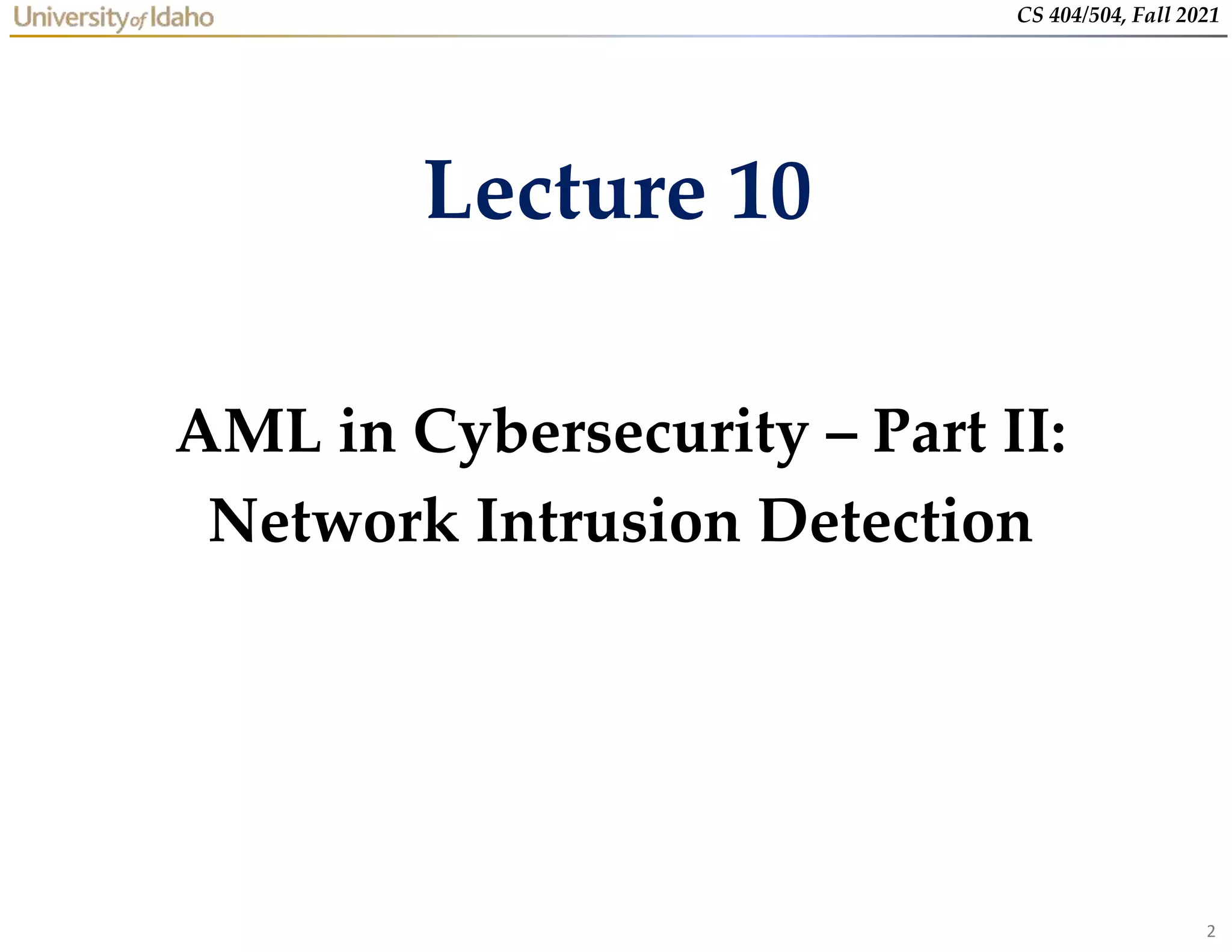 This document provides an outline for a lecture on adversarial machine learning in network intrusion detection. It discusses network intrusion detection systems (NIDS) and how machine learning can be used for anomaly detection in NIDS. It introduces two commonly used datasets for evaluating NIDS - the NSL-KDD and CSE-CIC-IDS2018 datasets. It then describes several machine learning models that can be used for anomaly detection in NIDS, including one-class SVMs, autoencoders, variational autoencoders, and sequence-to-sequence models. Finally, it discusses adversarial attacks against machine learning models for NIDS.