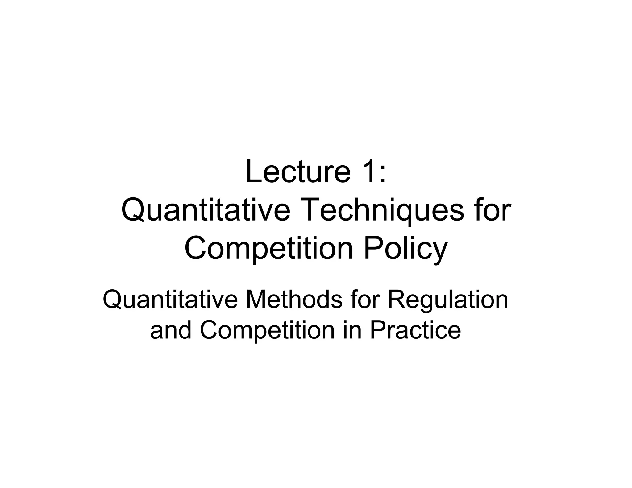 Quantitative techniques are increasingly used in competition policy to delineate markets, analyze market structure and competition, and evaluate efficiencies. The lecture introduces various quantitative techniques used in different applications including elasticity estimation, concentration indices, price correlation analysis, and simulation models. While market power can encourage innovation, it also reduces allocative and productive efficiency. There is a need to balance ex-ante innovation incentives with ex-post availability of innovations.