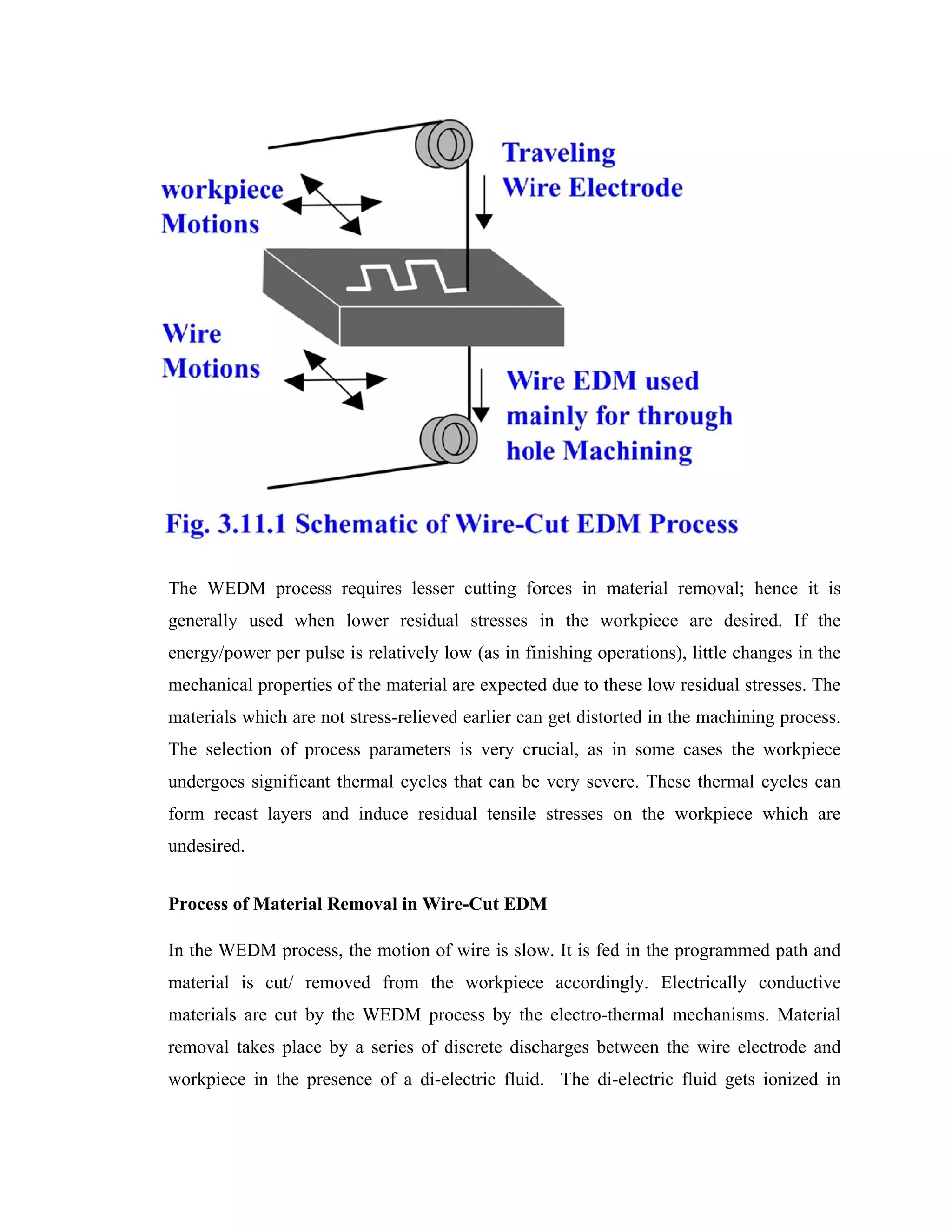 The Wire Electric Discharge Machining (WEDM) process involves a thin metallic wire being fed through upper and lower guides onto a submerged workpiece. Electrical discharges occur between the wire electrode and workpiece, melting and removing small amounts of material. Key parameters that affect the WEDM process include voltage, current, pulse on/off times, wire feed rate, and dielectric fluid properties. WEDM can cut hard metals and complex shapes for applications in aerospace, electronics, and die/mold manufacturing.