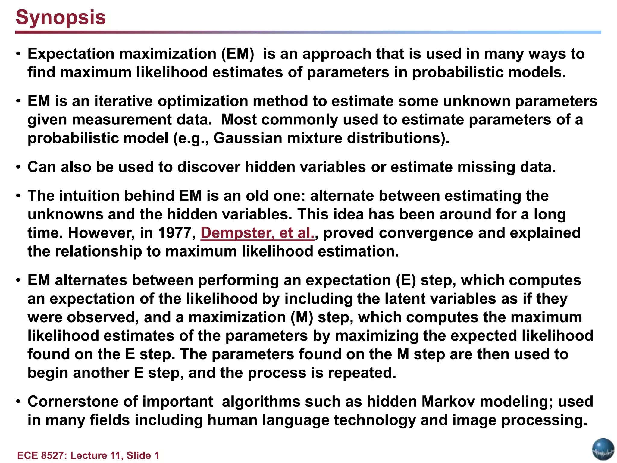 This document discusses the Expectation Maximization (EM) algorithm. EM is an iterative method used to find maximum likelihood estimates of parameters in probabilistic models. It estimates parameters given measurement data, commonly for Gaussian mixture distributions. EM alternates between an expectation (E) step, which computes the expected likelihood including latent variables, and a maximization (M) step, which computes parameter estimates maximizing the expected likelihood. The EM algorithm converges by ensuring that the expected log likelihood is increased with each iteration. Jensen's inequality and the EM theorem prove that this process will converge to a local maximum of the likelihood function.