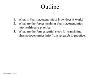 The document discusses the principles of pharmacogenomics. It defines pharmacogenomics as using genetic information to predict drug response. The key forces driving pharmacogenomics in healthcare are reducing adverse drug reactions and drug development costs. There are four steps to translating pharmacogenomic research to practice: 1) identify genetic variants related to drug response, 2) associate variants with past responses, 3) validate prospective impact on outcomes, and 4) require genetic testing before treatment.