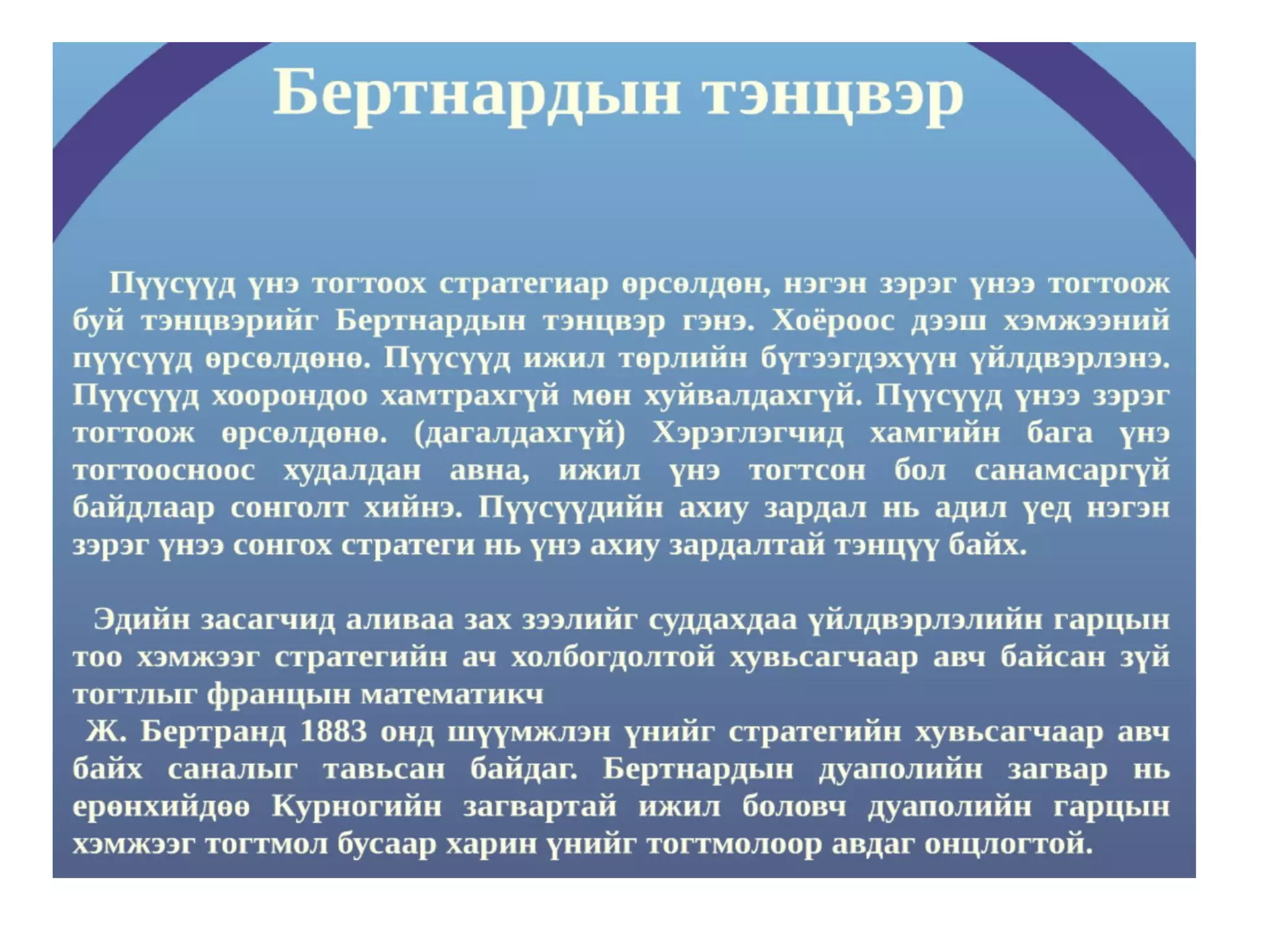 Пүүс бүр хоёрболомжит стратегитай байна.