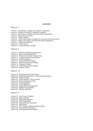 These lecture notes cover algorithms and their analysis over 4 modules. Module I introduces algorithms, their properties, analysis of complexity and asymptotic notations. It covers analysis of sorting algorithms like merge sort, quicksort and binary search. Module II covers dynamic programming and greedy algorithms. Module III covers graph algorithms like BFS, DFS and minimum spanning trees. Module IV covers advanced topics like fast Fourier transform, string matching, NP-completeness and approximation algorithms.
