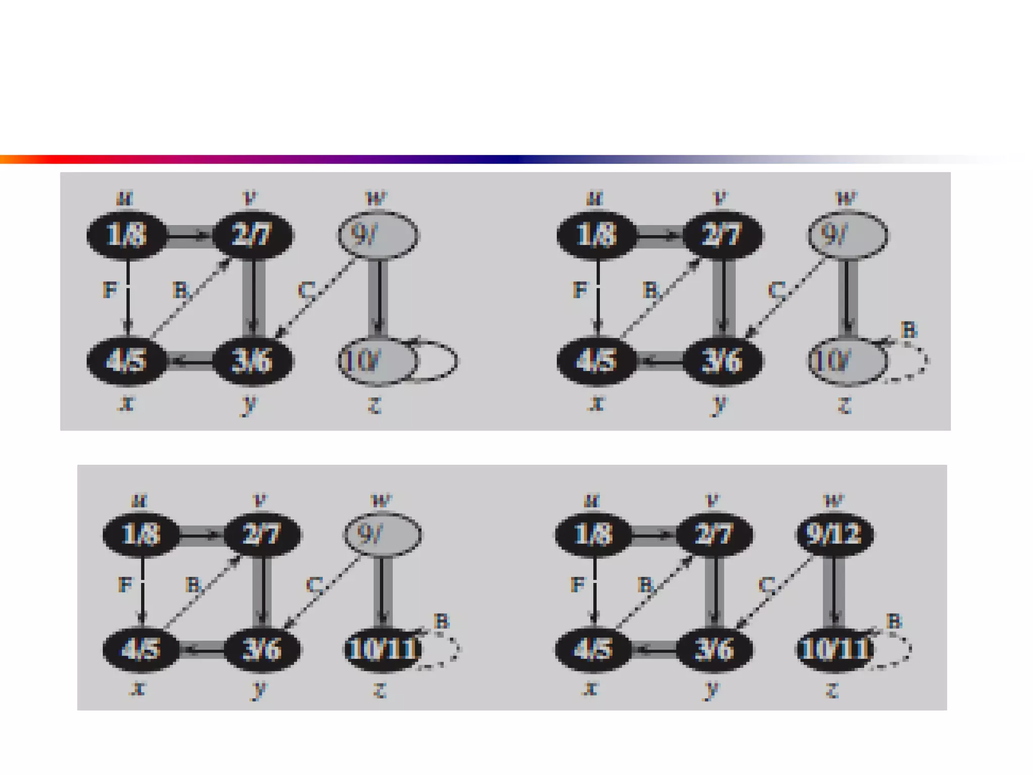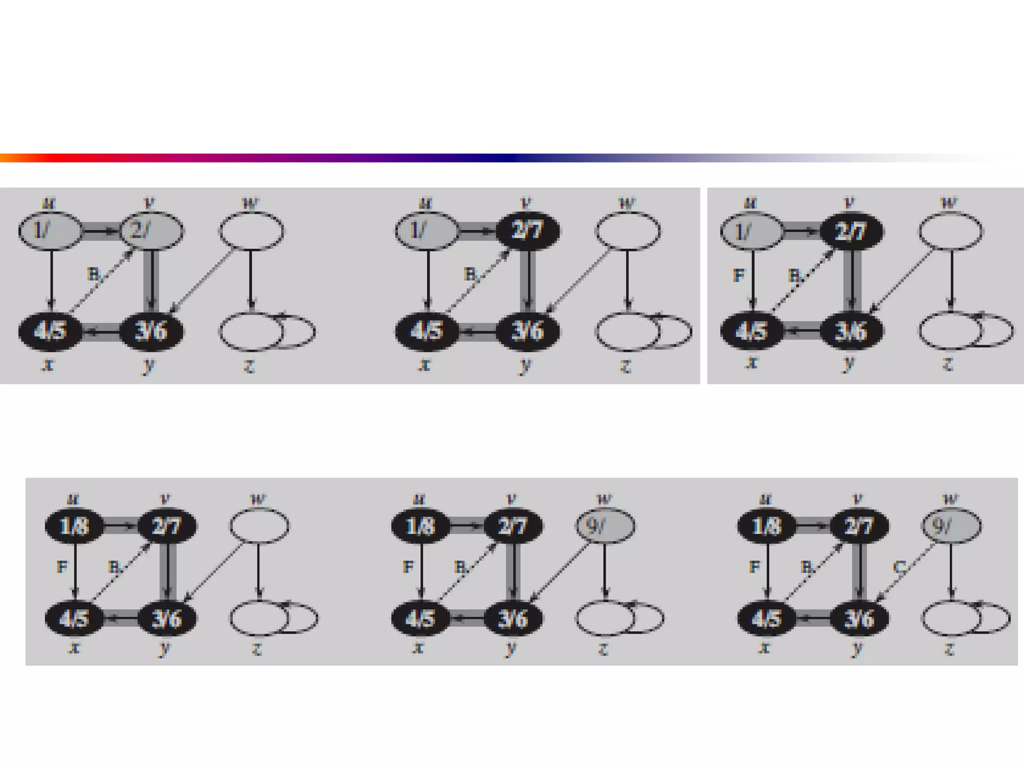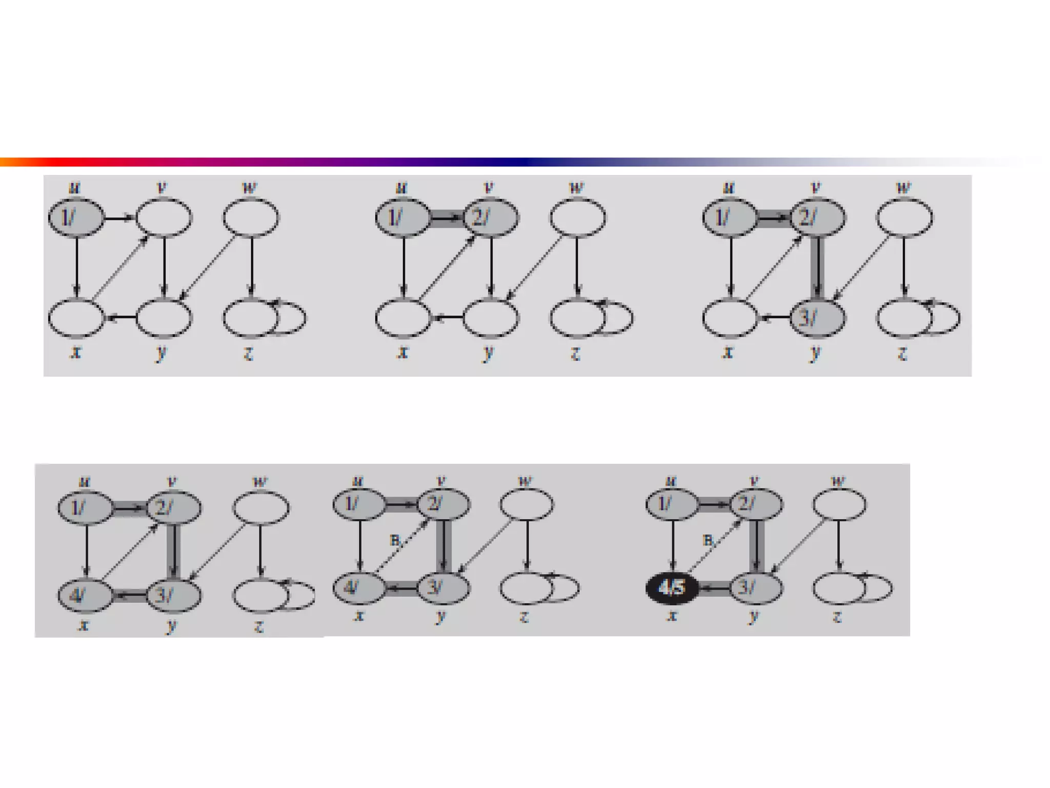 This document defines key graph concepts like paths, cycles, degrees of vertices, and different types of graphs like trees, forests, and directed acyclic graphs. It also describes common graph representations like adjacency matrices and lists. Finally, it covers graph traversal algorithms like breadth-first search and depth-first search, outlining their time complexities and providing examples of their process.
