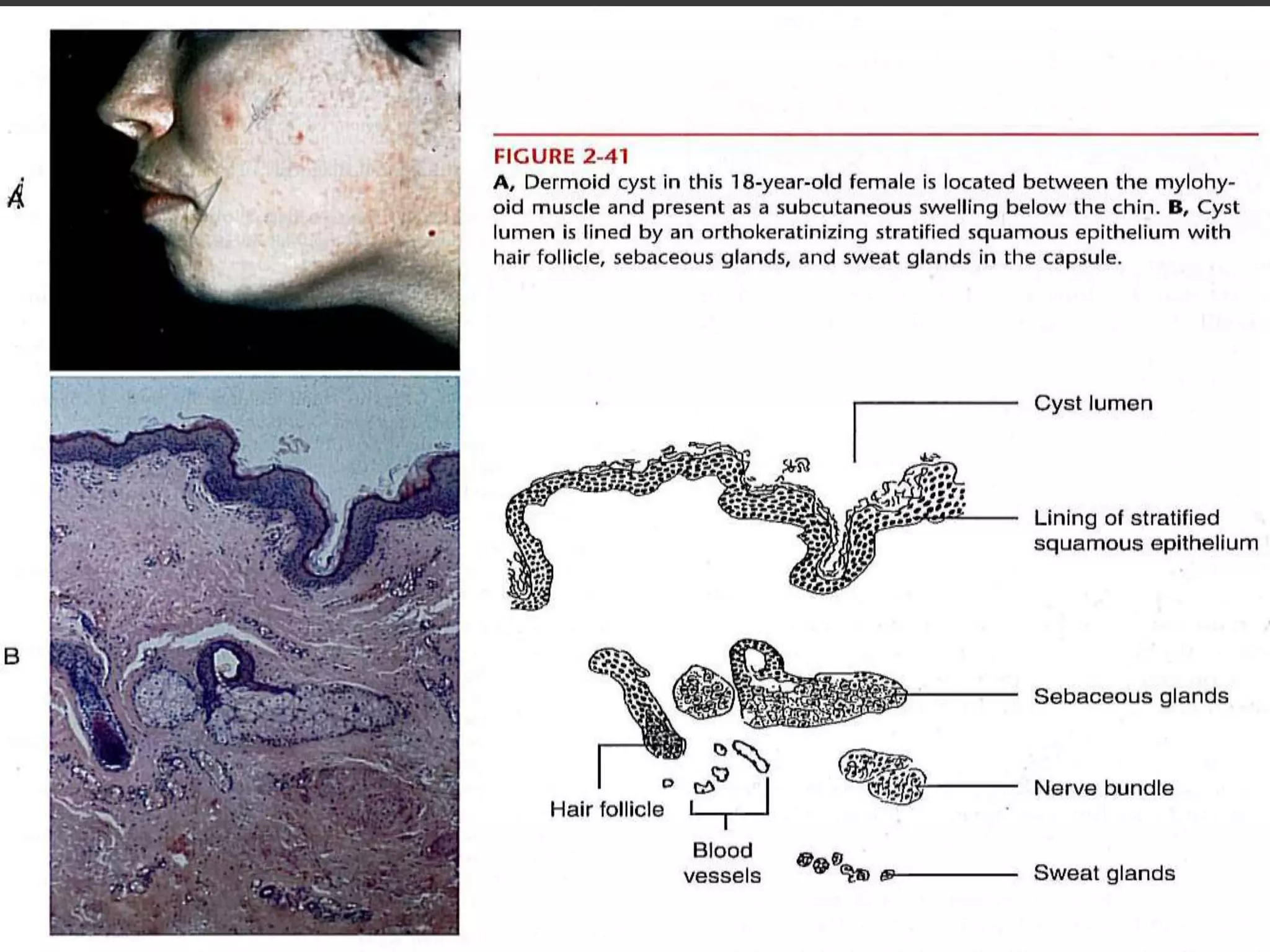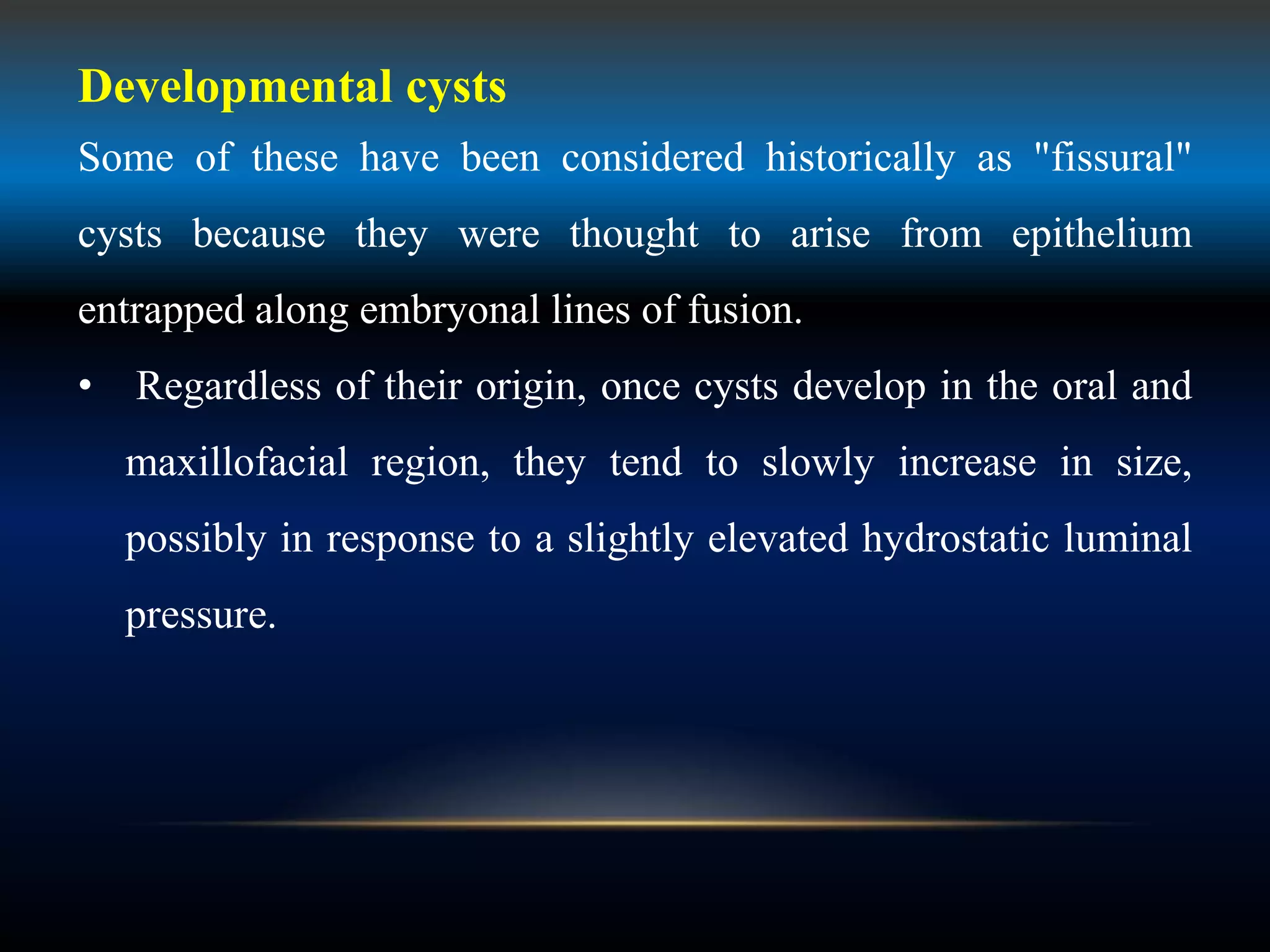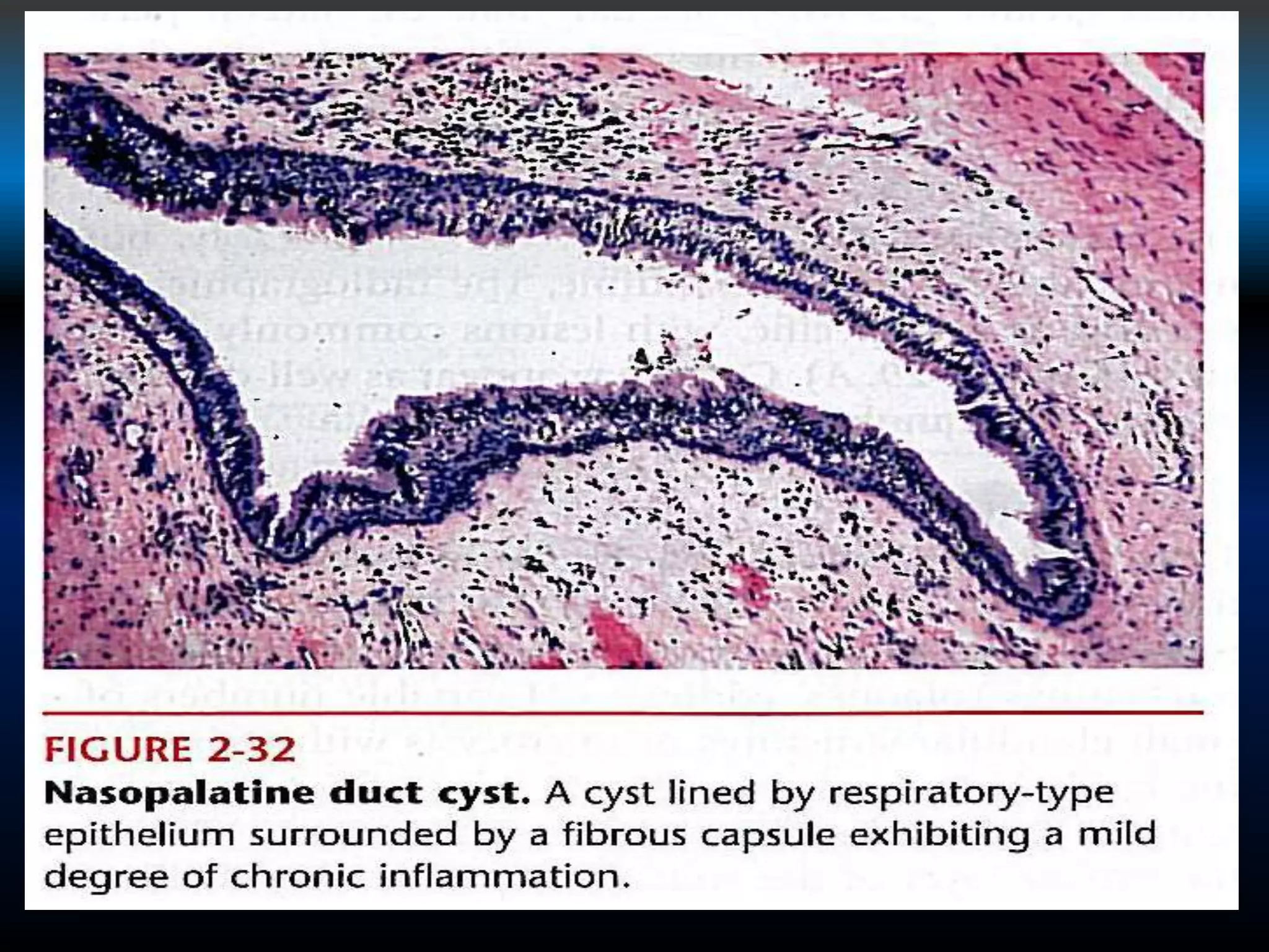Developmental cysts can arise from epithelial remnants during embryonic development. The nasopalatine duct cyst arises from remnants of the nasopalatine duct in the midline maxilla. It appears on imaging as an oval radiolucency between central incisors. Histologically it is lined by respiratory, cuboidal, or squamous epithelium. Surgical enucleation is the treatment and recurrence is rare. The nasolabial cyst arises from remnants of the nasolacrimal duct in the soft tissues of the anterior maxilla. It presents as a unilateral swelling and is treated with surgical excision.
