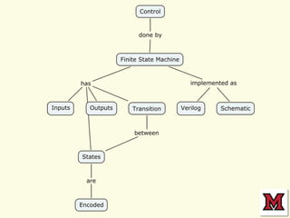 This document summarizes a lecture on finite state machines: 1. The lecture discusses finite state machines, including examples, state diagrams, state tables, and implementing FSMs in Verilog. 2. As an example, the lecture examines a circuit to store 16 bits of information and check if four 4-bit numbers are equal. 3. The problem set asks students to build Verilog systems for state machines, including one to control an elevator based on floor and button input.