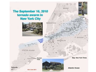 The document discusses three instruments that measured cosmic ray neutron intensity during Hurricane Sandy as it passed through the Northeast US in late October 2012. The instruments included a neutron monitor in Newark, DE and two COSMOS probes, one in Beltsville, MD and the other in Shale Hills, PA. The COSMOS probes responded differently due to one experiencing heavy rainfall whereas the other did not. The Newark monitor showed a response to decreasing atmospheric pressure. Data from all instruments is available online.