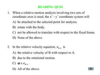1. The document outlines the day's objectives of describing rigid body velocity in terms of translation and rotation components, and performing relative motion velocity analysis of points on rigid bodies.
