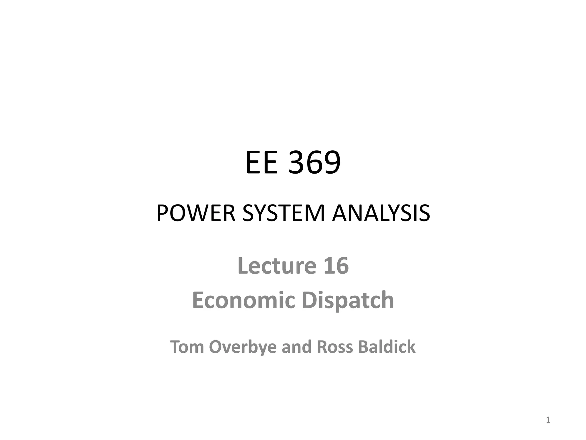 This document discusses economic dispatch and the lambda iteration method for solving the economic dispatch problem. It begins with introducing economic dispatch and formulating it as a constrained optimization problem. It then explains how to solve it using Lagrange multipliers and the lambda iteration algorithm. The document provides an example of applying lambda iteration to a two and three generator system both with and without generator limits. It concludes with briefly discussing including transmission losses in the economic dispatch formulation.