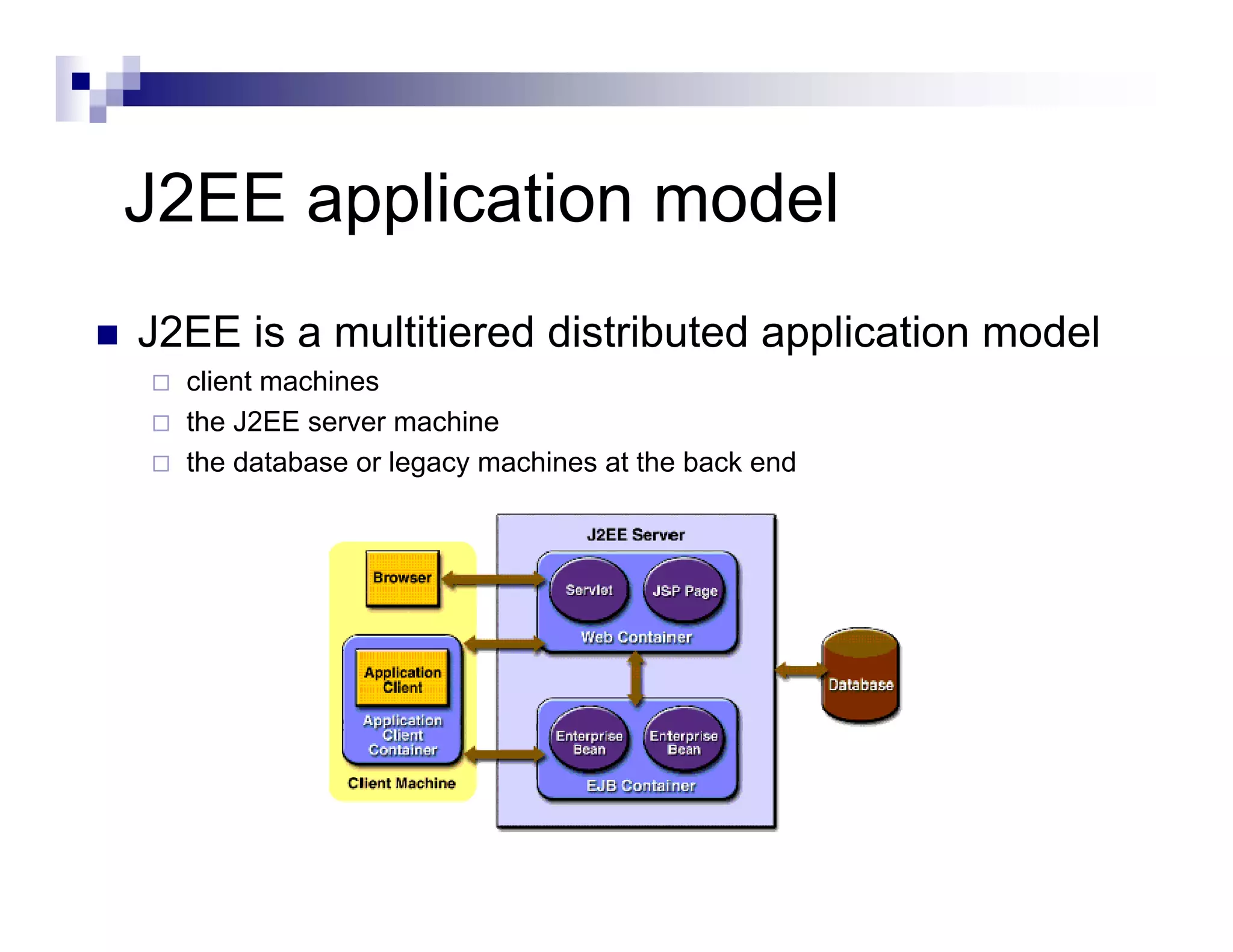 The document discusses Java Database Connectivity (JDBC) and how it allows Java code to execute SQL statements inside relational databases. It covers the JDBC API and how it provides a standard interface to different databases. It also discusses the JDBC-ODBC bridge which allows Java code to access databases via ODBC. The document provides an example of JDBC code to connect to a database, execute a query, and access the result set. It discusses using connection pooling and JNDI lookups in J2EE applications to connect to databases.