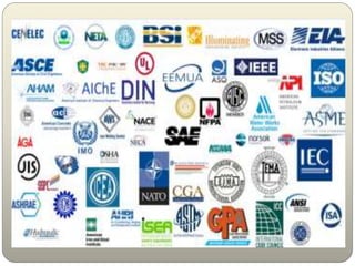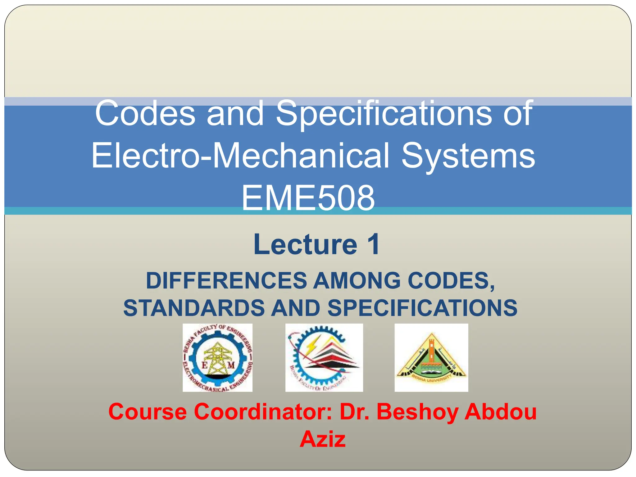 This document outlines the contents and structure of a lecture on differences among codes, standards, and specifications for electro-mechanical systems. The lecture will cover international standards like IEC, firefighting codes from NFPA, HVAC standards, and international building codes. It will be graded based on midterms, assignments, experiments, and a final exam. References will include Egyptian codes, IEC, NFPA, ASHRAE, and IEEE standards. Definitions provided clarify that standards describe how to do something, codes are legally enforceable and reference standards, and specifications provide additional product or application requirements beyond codes and standards.