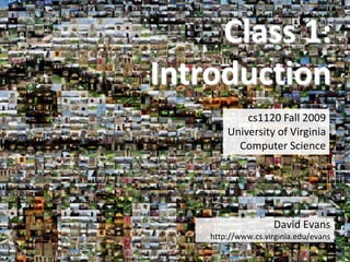 This document provides an overview of a computer science course being taught at the University of Virginia. It discusses what computer science is, comparing it to science, engineering, and the liberal arts. It outlines the course's roadmap from Euclid to modern topics like quantum computing and the World Wide Web. It also provides information about course resources, expectations, and assignments.