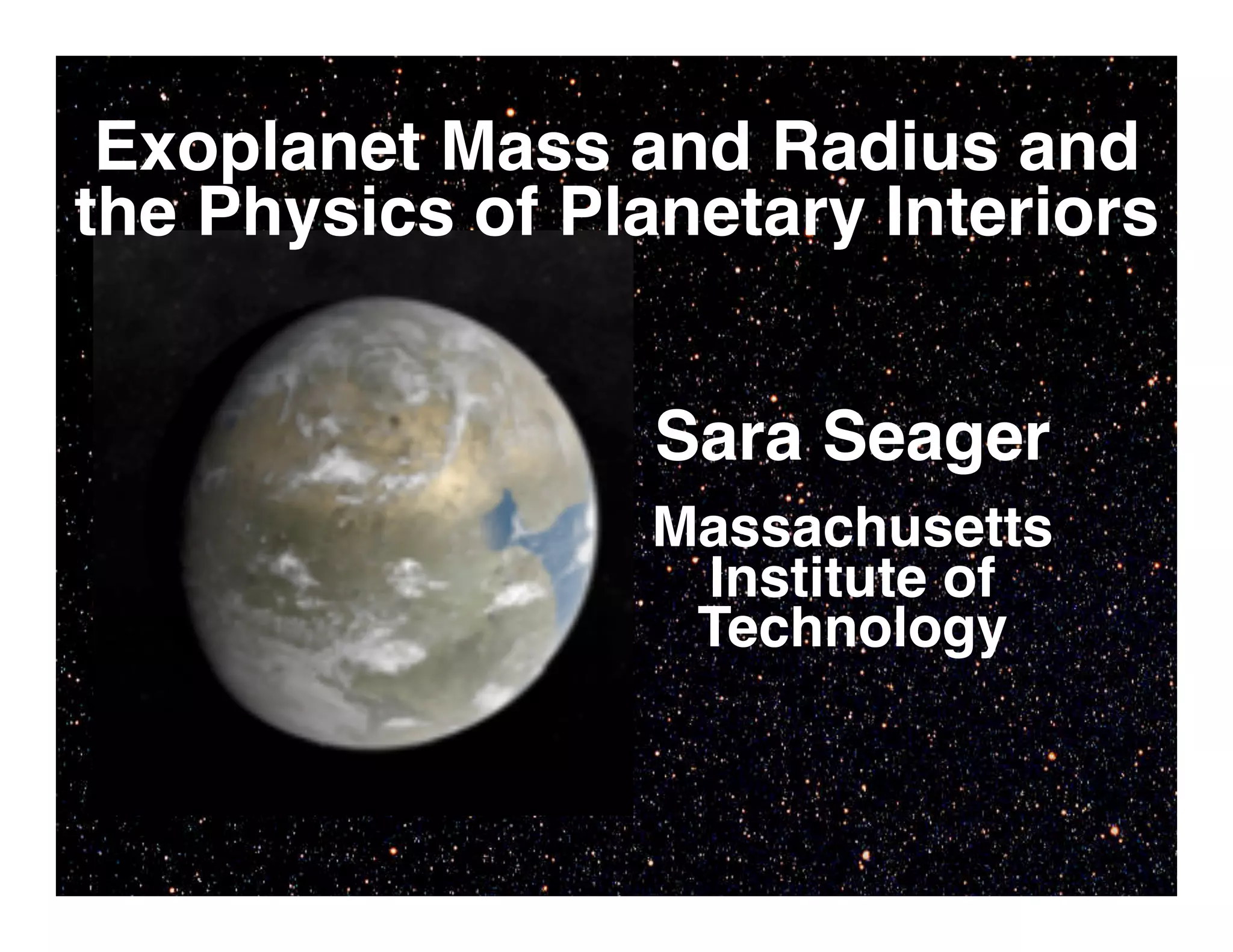 This document discusses using exoplanet mass and radius measurements to constrain interior compositions. Mass-radius relationships follow a common functional form for terrestrial planets. While these relationships are well understood, individual super Earth interiors have permanent degeneracies due to only having mass and radius data. Kepler will provide hundreds of new exoplanet candidates, including systems with multiple transiting planets, advancing understanding of planet formation, migration and evolution by connecting observational data to models of planet interiors, atmospheres and populations.