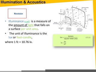 1. The document discusses various types of electric lighting sources, their characteristics, and applications. It focuses on illuminance, efficacy, color rendering index, and the differences between incandescent, halogen, fluorescent, and discharge lamps.
