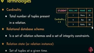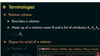 The document discusses the relational database model and relational query languages. It describes the relational model as being over 35 years old but still the foundation of modern database systems. It is used by major commercial databases and provides a simple yet expressive model through query languages like SQL. The document defines key concepts like relations, attributes, tuples, domains, schemas, instances, and NULL values. It also covers topics like keys, views, and updating views in relational databases.