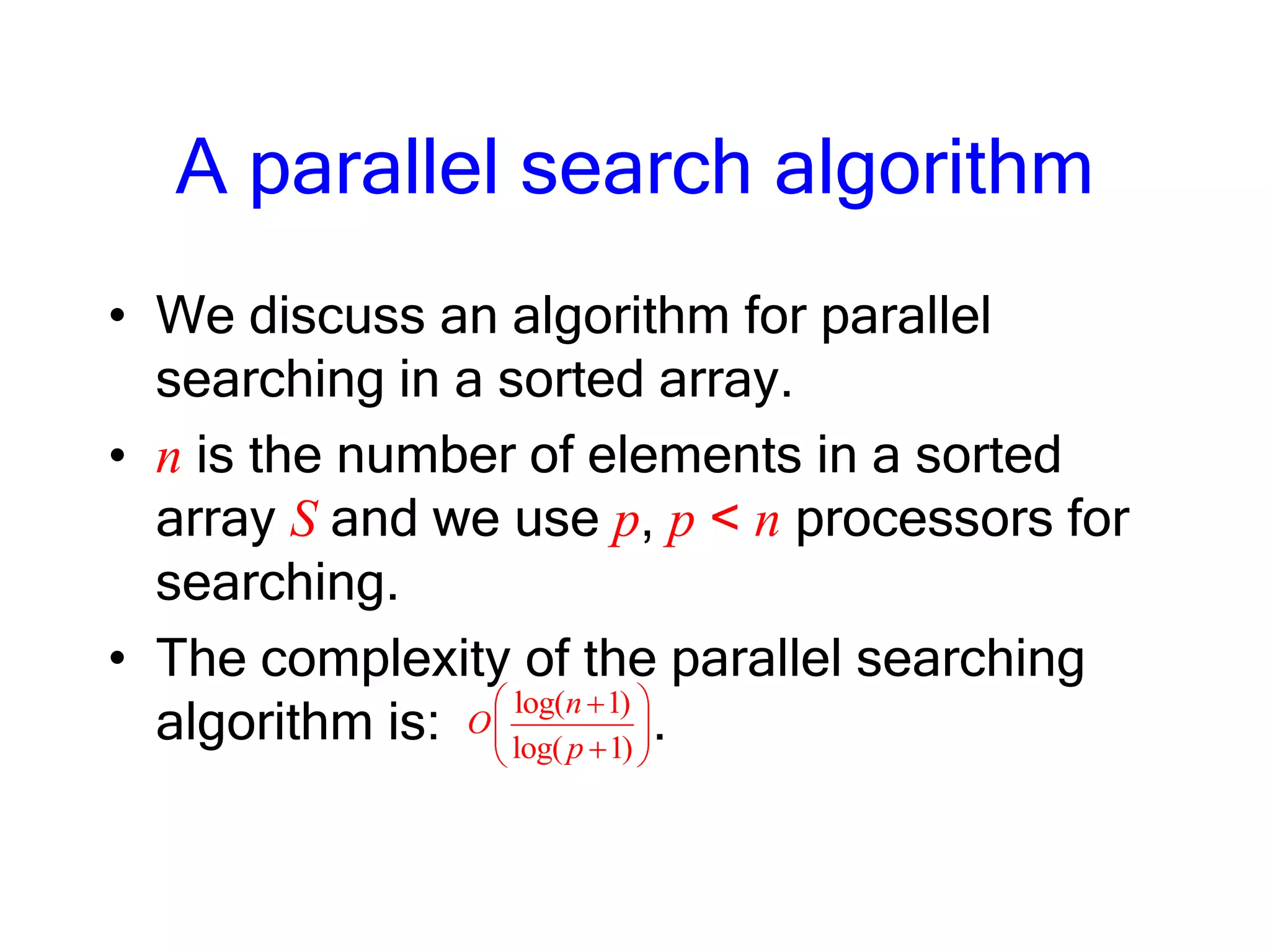 - A parallel search algorithm finds two elements in a sorted array that bracket a query element in logarithmic time using p processors (paragraph 1).