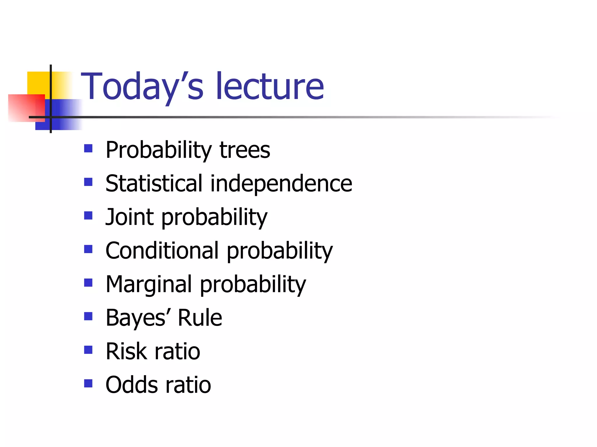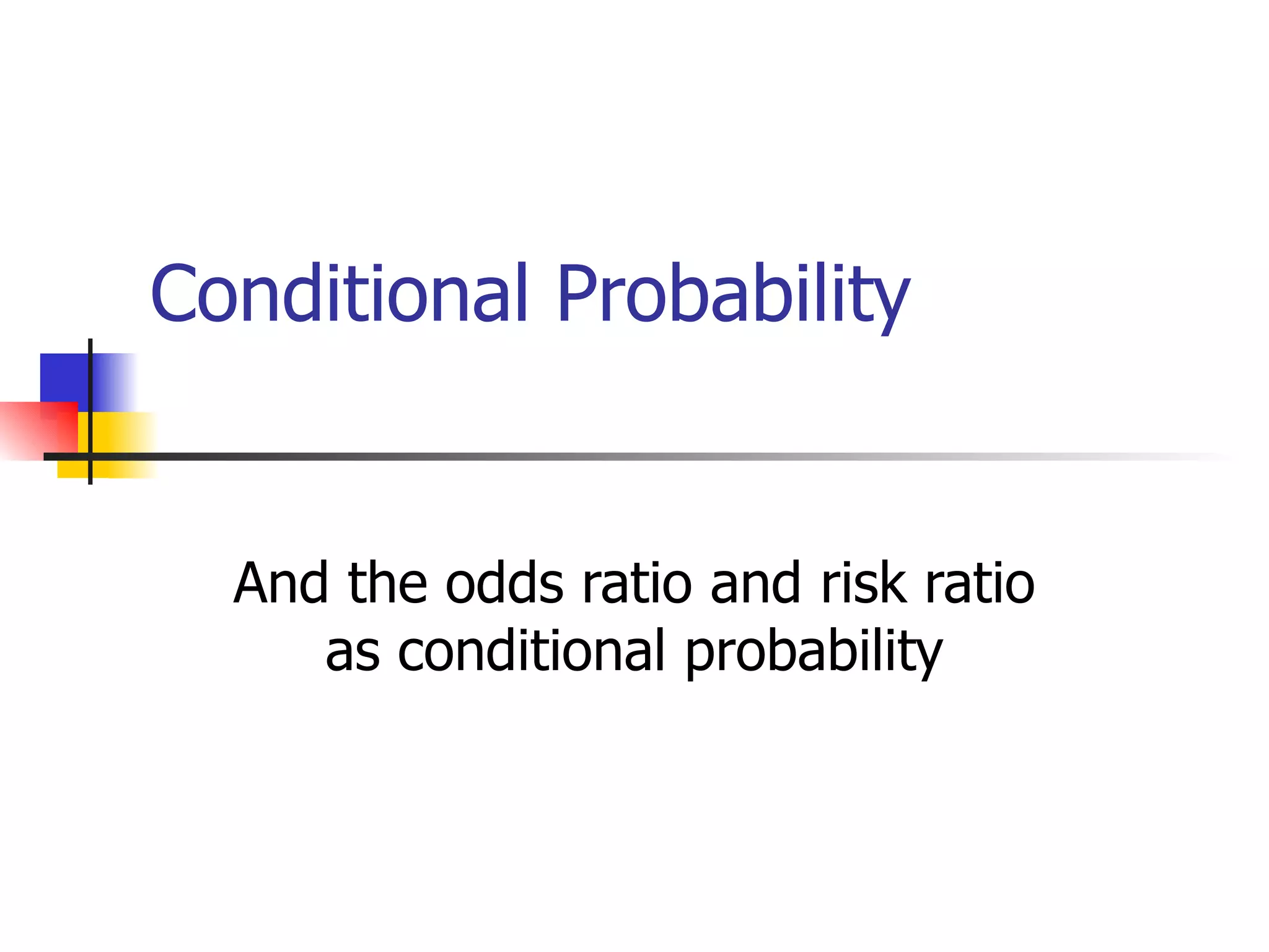 The document discusses conditional probability and how odds ratios and risk ratios can be interpreted as conditional probabilities. It provides examples of how to calculate odds ratios from case-control study data and risk ratios from cohort study data. It also discusses how odds ratios from studies where the outcome is common should be interpreted as increased odds rather than risk, and how odds ratios can be converted to risk ratios using a simple formula.