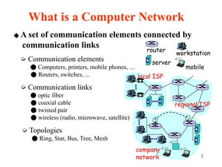 The document provides an introduction to computer networks. It discusses that a network is a set of communication elements like computers, printers, and routers connected by communication links like fiber optic cables. Networks allow sharing of resources and information between users. The key components of a network are its topology, hardware, software, and applications. Common network topologies include ring, star, bus, tree and mesh configurations.