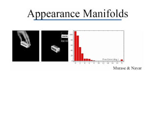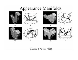 This document describes using principal component analysis (PCA) for object recognition from images. PCA is used to represent objects in an "eigenspace" where each object is represented by a point defined by its coordinates along the principal axes of variation among sample images. This provides an efficient representation that can handle variations in viewpoint, illumination, etc. by requiring fewer samples. The key steps are: (1) collect sample images and represent each as a high-dimensional vector, (2) compute eigenvectors of the sample covariance matrix to define the eigenspace, (3) project new images into this space for recognition.