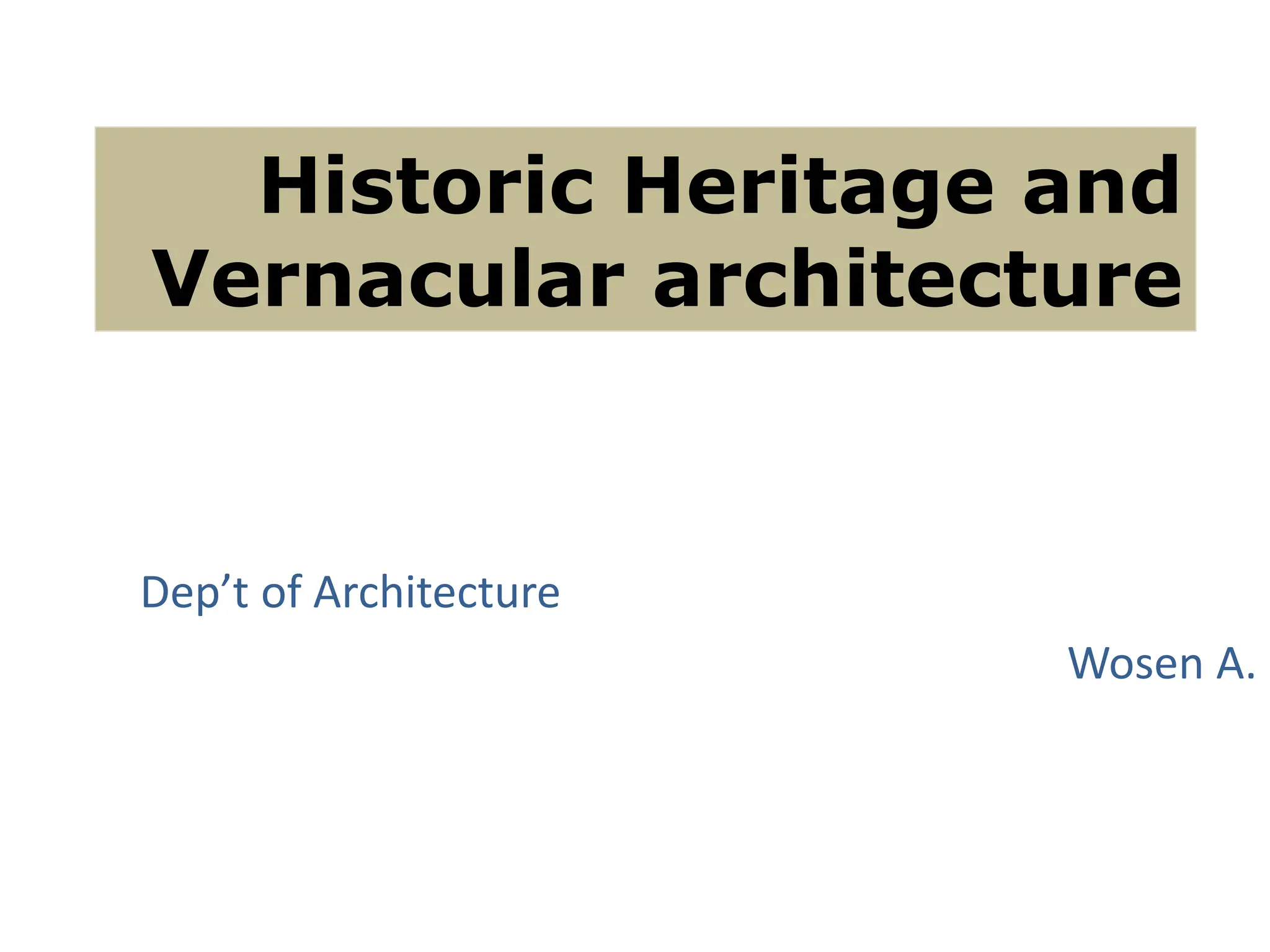 This document provides an overview of historic heritage and vernacular architecture in Ethiopia. It discusses the challenges of preserving historic sites and outlines some common tools used in archaeological excavations. It then examines examples of vernacular architecture from different regions of Ethiopia, including the Afar, Tigray, Amhara, Dorze, Gurage, Oromo, Sidama, and Konso peoples. Construction techniques, materials, and house types are described for each group. The document emphasizes that Ethiopia's architectural heritage is diverse and strongly linked to the country's ethnic and environmental diversity.