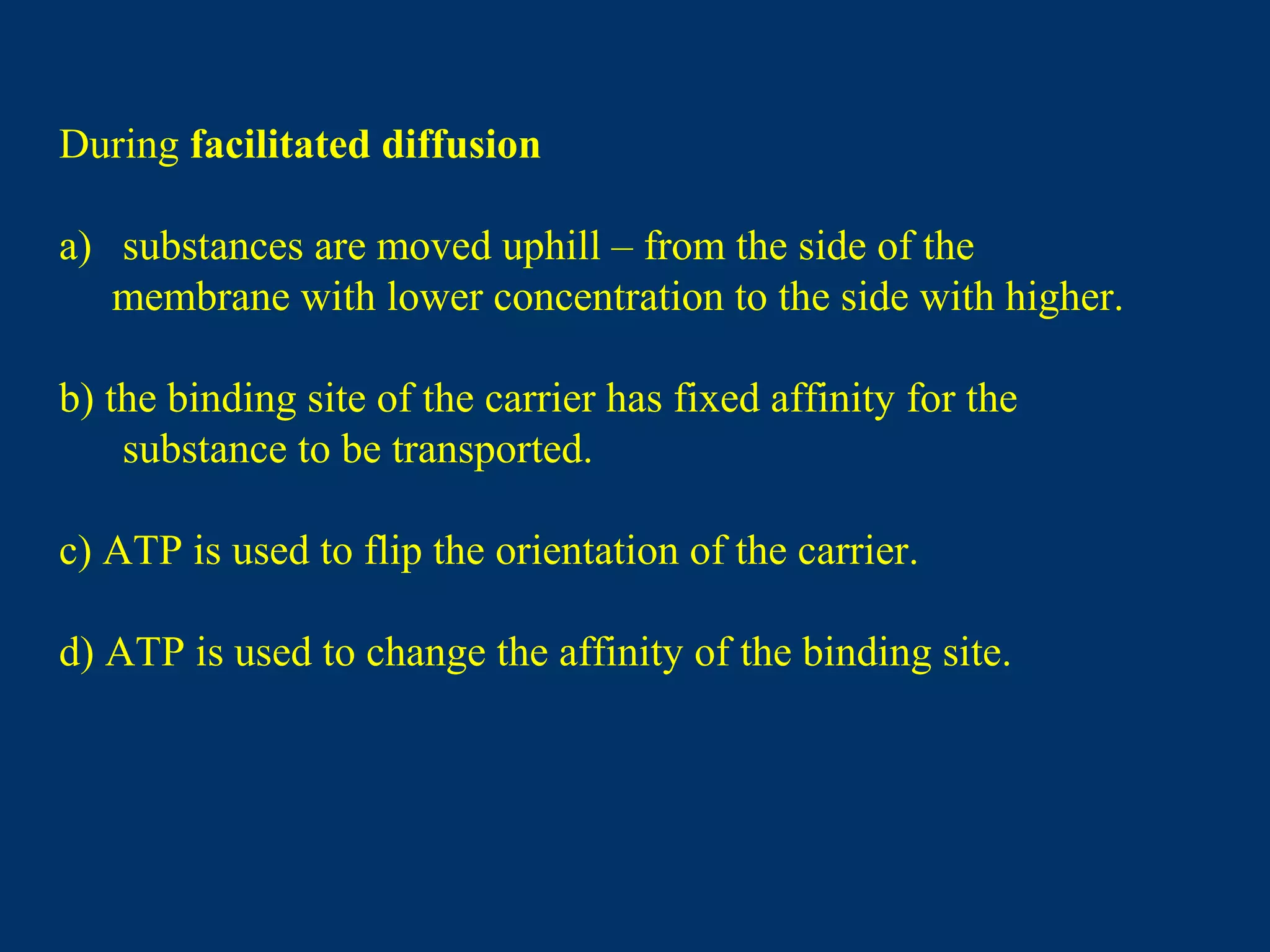 1. The document discusses facilitated diffusion, which is the transport of substances across a membrane with the aid of carrier proteins. It involves substances moving uphill against a concentration gradient, with the carrier protein having a fixed affinity for the substance and ATP being used to flip the orientation or change the affinity of the binding site.