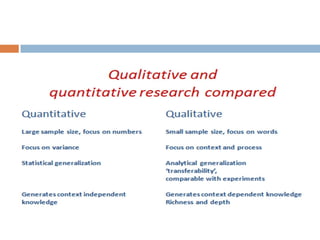 The document discusses sampling and analysis methods from an environmental science perspective. It defines a sample as a subset of a population that is used to make inferences about the entire population. There are two main types of sampling: probability sampling which uses random selection, and non-probability sampling which does not use random selection. Some specific sampling methods discussed include random sampling, stratified sampling, systematic sampling, cluster sampling, convenience sampling, purposive sampling, quota sampling, and snowball sampling. Ethical considerations for data collection like informed consent and confidentiality are also covered.