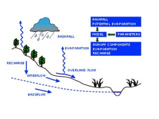 The document discusses various hydrological processes including interception, depression storage, infiltration, runoff, streamflow, and runoff modeling. It provides information on how interception by vegetation affects rainfall amounts and canopy storage capacity. Depression storage is explained as water trapped in low-lying areas that drains or infiltrates over time. Factors influencing infiltration rates and common measurement techniques are outlined. The generation of runoff from excess precipitation and factors controlling stream hydrographs are summarized. Finally, an overview of the development of conceptual runoff models and their applications is provided.