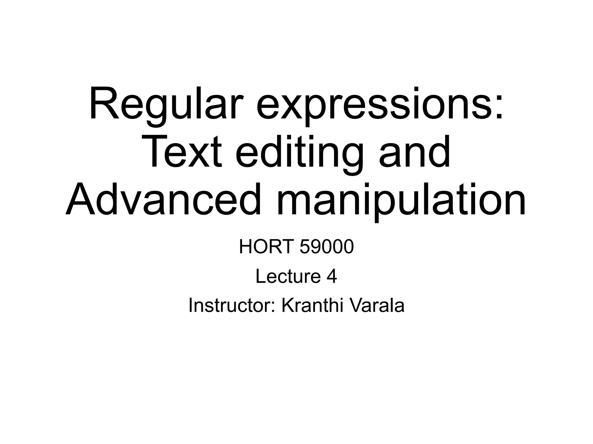 This document discusses text editors and regular expressions. It provides information on common text editors like nano, emacs, and vi and their features. It also covers the basics of regular expressions, including special characters, character classes, quantifiers, and examples of how to use grep, sed, and awk with regular expressions.