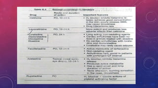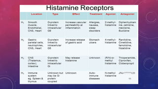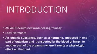 This document discusses autacoids, which are locally acting hormones. It focuses on histamine, an important inflammatory mediator. Histamine is formed from the amino acid histidine and is released from mast cells and basophils. It plays a role in inflammation, allergies, and gastric acid secretion. Antihistamines work by competing with histamine for binding sites at H1 receptors. First generation antihistamines easily cross the blood brain barrier and cause sedation, while second generation antihistamines have less side effects. Histamine causes effects in various organ systems, and antihistamines are used to treat allergic diseases, colds, motion sickness, and other conditions.