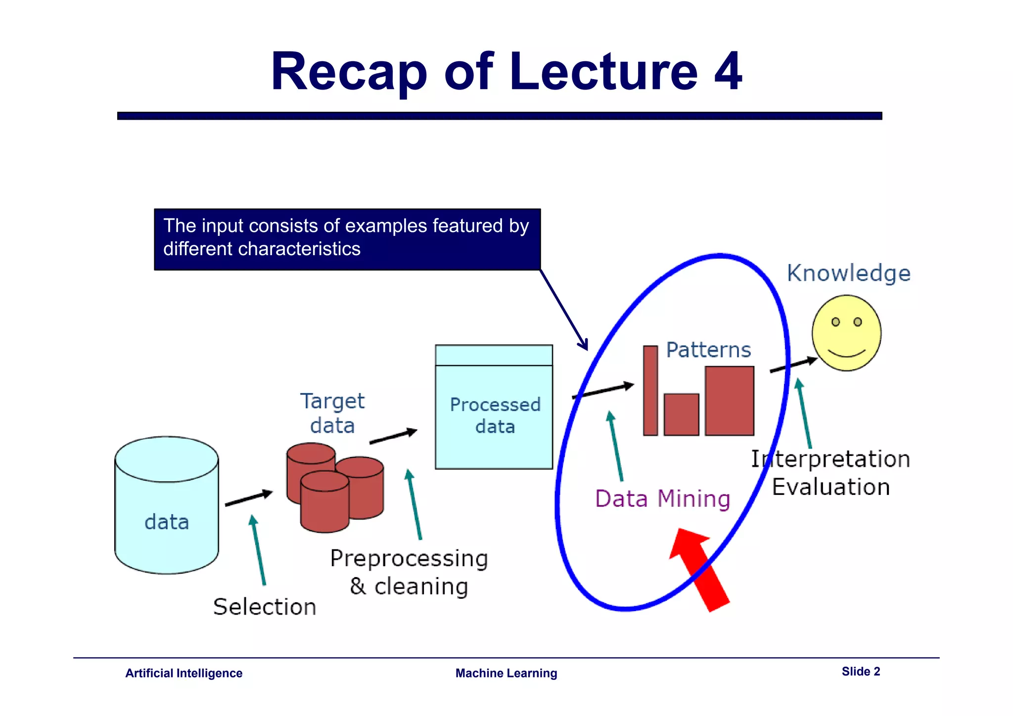 This document provides a summary of a lecture on machine learning and decision trees. It recaps the previous lecture and outlines the goals of today's lecture, which will review data classification, decision trees, and the ID3 algorithm. The lecture will also cover how to build decision trees using ID3 and C4.5 and demonstrate running C4.5 on the Weka machine learning software.