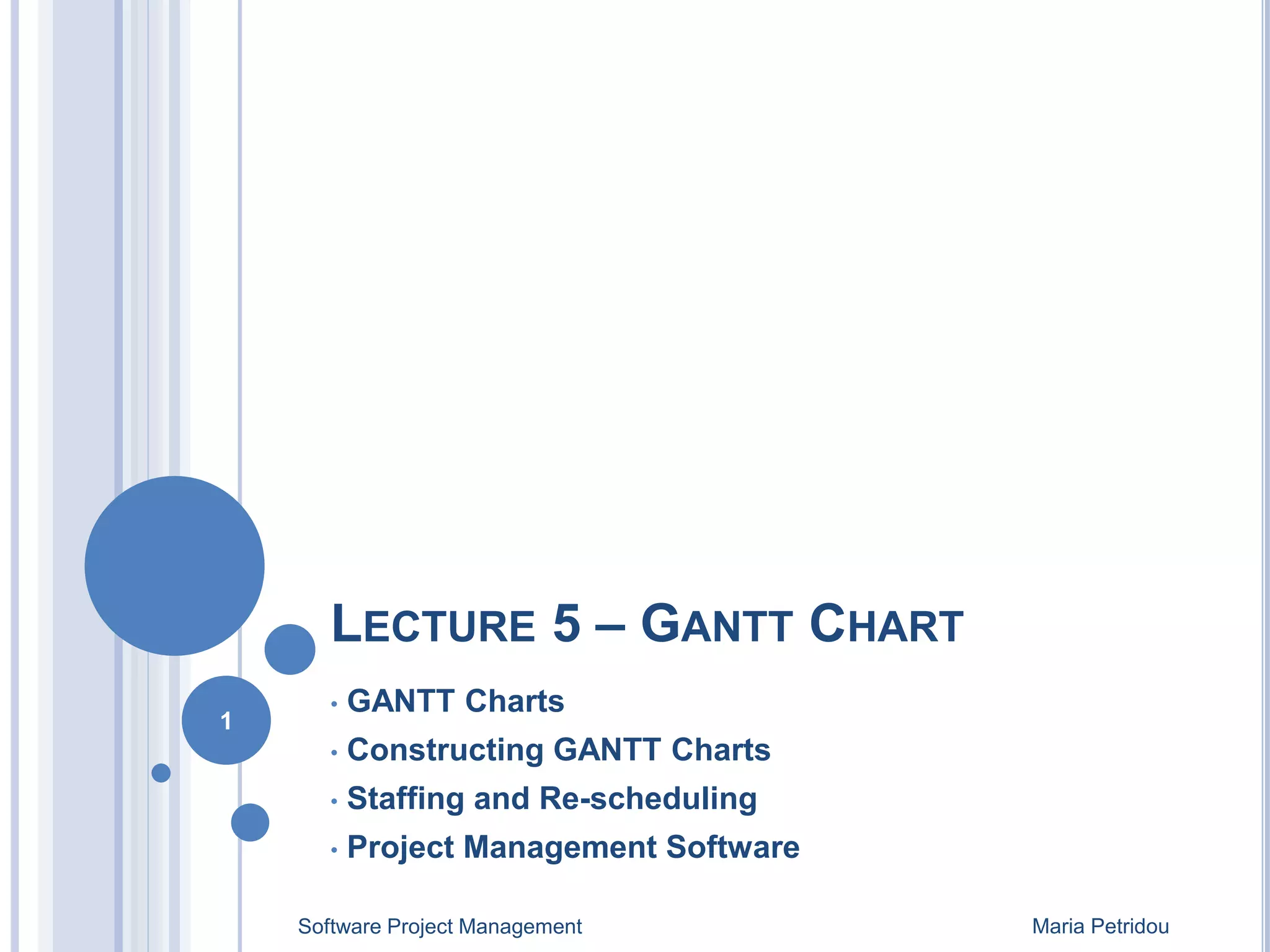 GANTT charts are a type of bar chart used to illustrate project schedules. They show the start and end dates of tasks, their duration, and dependencies between tasks. To construct a GANTT chart, critical tasks are scheduled first followed by non-critical tasks within their time windows. Staff and resources are then allocated to tasks based on availability. The chart can be re-scheduled if needed due to changes in staffing or equipment availability. Project management software helps automate GANTT chart creation and resource smoothing but decisions still require human judgment.