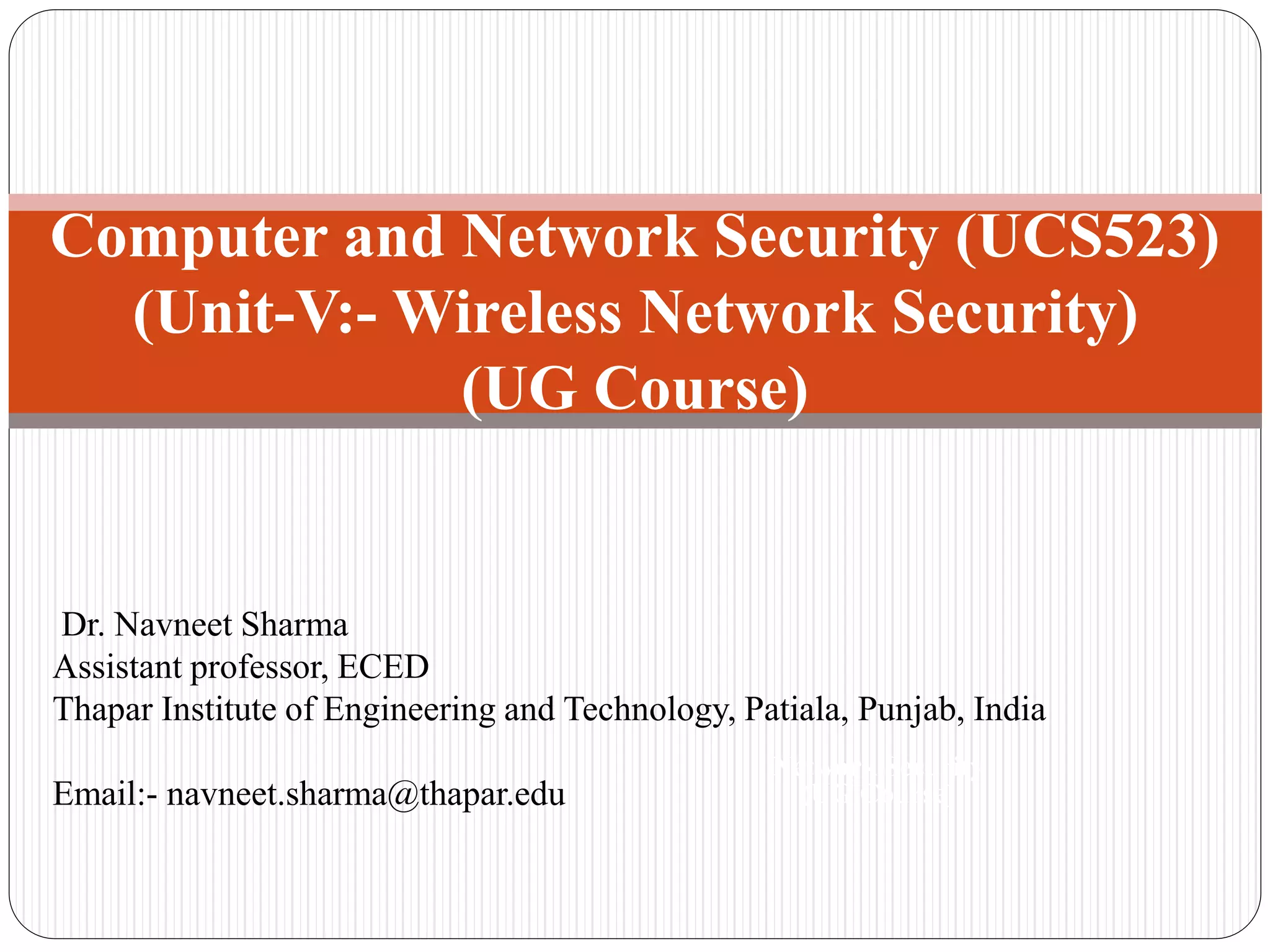 This document summarizes wireless network security standards and protocols including IEEE 802.11, WPA, WAP, and WTLS. It discusses authentication, encryption, and key management in 802.11i and the phases of operation. It provides an overview of the WAP programming model, markup language, and architecture including the WTP gateway. It describes how WTLS provides security between mobile devices and gateways based on TLS, and its handshake protocol. Finally, it mentions the security gap between WTLS and TLS domains when moving to WAP end-to-end security.