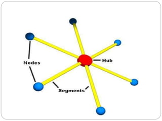 This document discusses data networking and communications. It defines telecommunications as technologies that allow information to be distributed at a distance with little delay. Computer networks like LANs, MANs, and WANs interconnect devices. LANs are small networks within a building or area, while WANs connect over large distances like between cities. The document also describes different network topologies (bus, ring, star), transmission mediums (coaxial cable, twisted pair, fiber optic), and network devices (hubs, routers, bridges, switches).