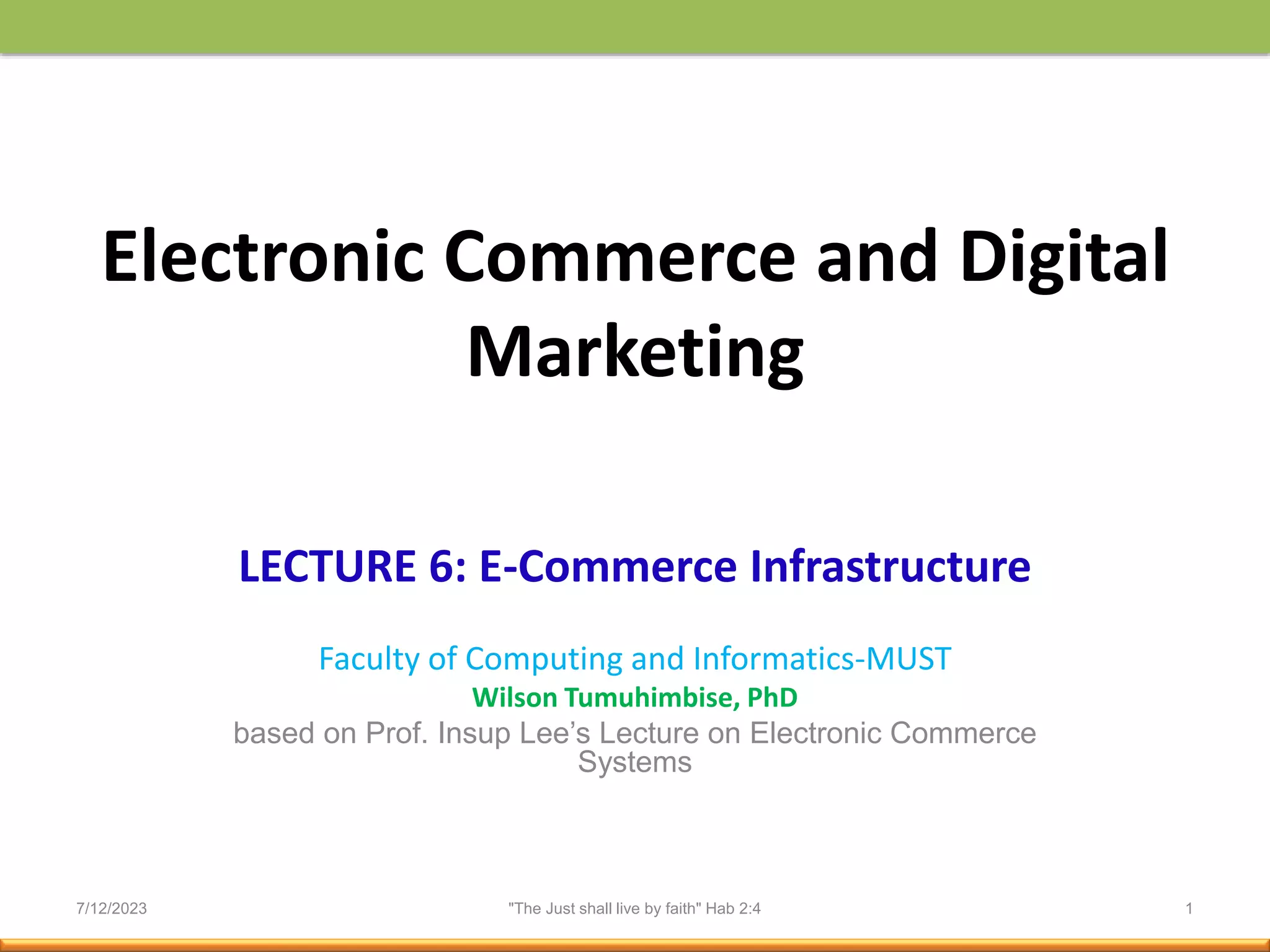 The document discusses the key components of e-commerce infrastructure and applications. It describes the main elements that enable e-commerce such as the internet, web servers, application servers and databases. It also outlines important aspects of e-commerce including business to consumer and business to business transactions, advantages like increased sales and decreased costs, and considerations around security, payment systems and transaction processing.