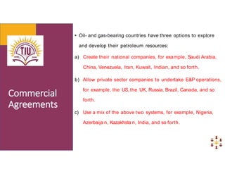 The document discusses reservoir development objectives and considerations. It outlines three options for countries to explore and develop petroleum resources: creating national oil companies, allowing private companies, or a mix. Development plans typically involve conceptual, initial, mid-term, and final plans over 10-15 year periods. Key considerations include resource estimates, production profiles, well strategies, facility needs, environmental regulations, and social objectives. Development aims to maximize recovery while generating economic benefits.