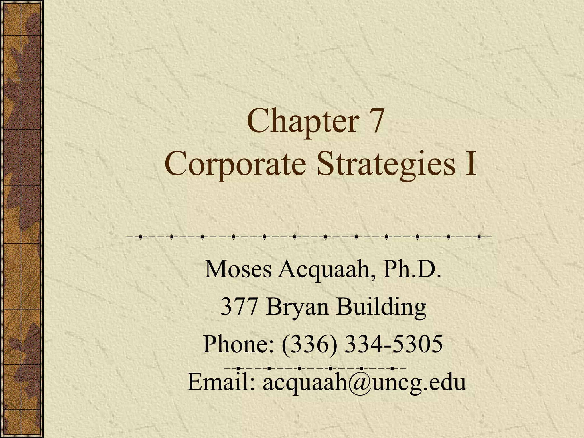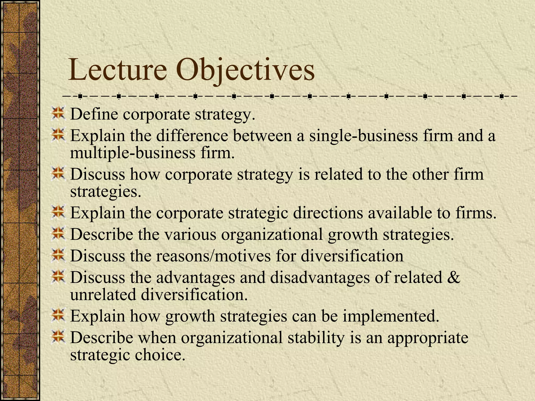 This document provides an overview of corporate strategy concepts. It defines corporate strategy as strategies concerned with the long-term direction of an organization's businesses. It distinguishes between single and multiple business organizations and explains how corporate strategy relates to competitive and functional strategies. The document outlines various corporate strategic directions including organizational growth, stability, and renewal. It also describes different growth strategies such as diversification, integration, concentration, and international expansion.