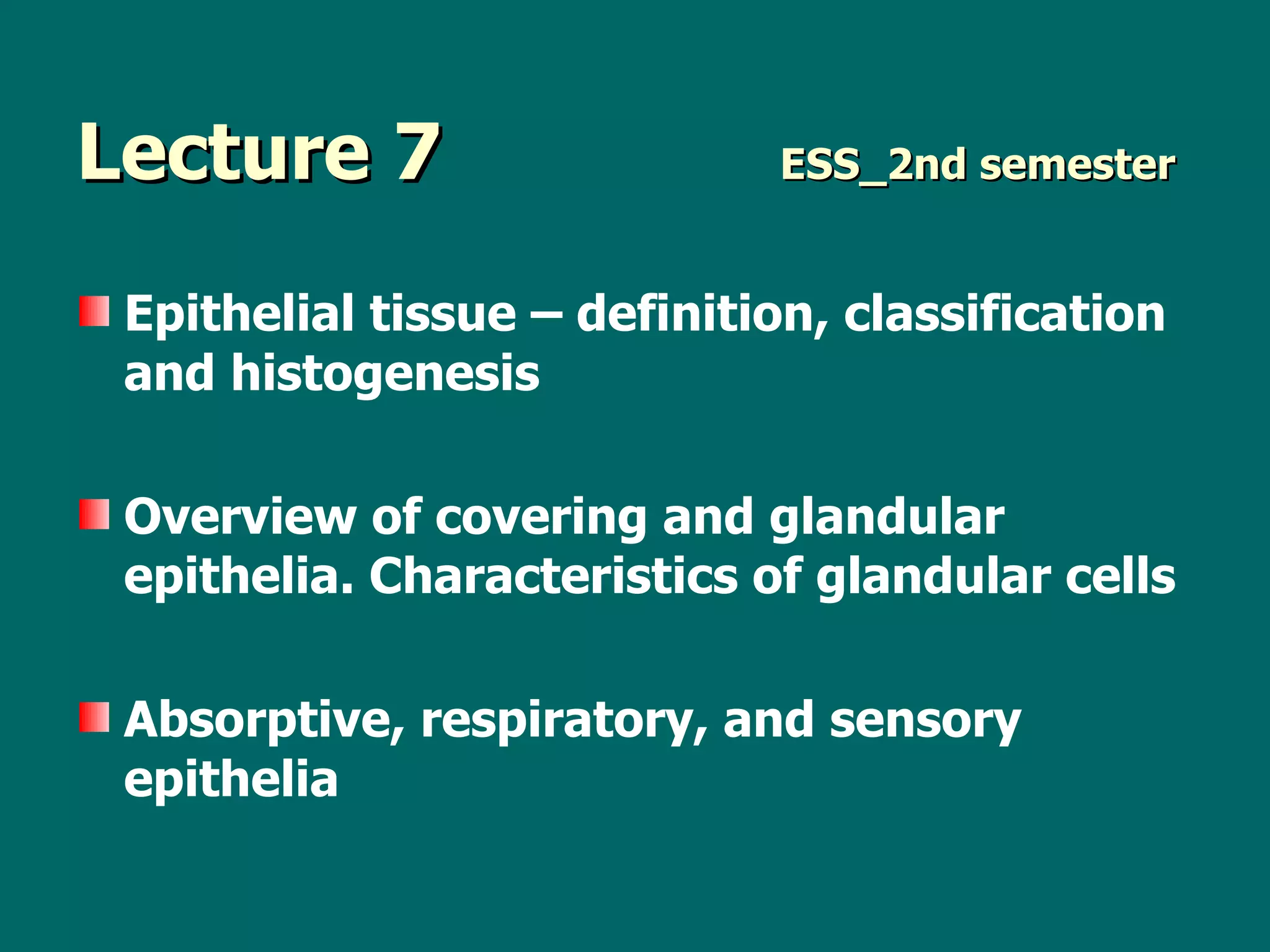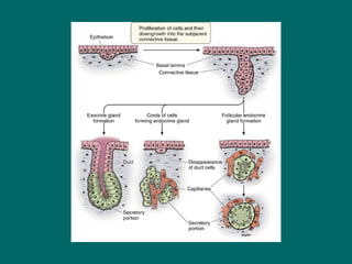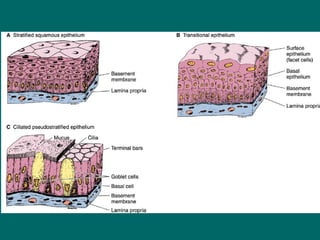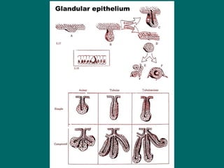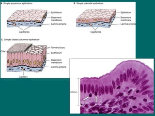 This document provides an overview of epithelial tissue, including its definition, classification, characteristics, and locations in the body. It discusses the four primary tissue types - epithelial, connective, muscle, and nerve tissue. It focuses on epithelial tissue, describing the two main types (simple and stratified), their subtypes based on cell shape, and examples of each epithelium's location and function. Key points covered include that epithelial tissue lines surfaces, derives from all germ layers, and lacks blood vessels.