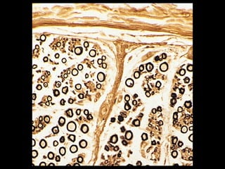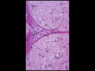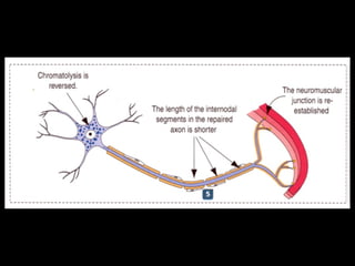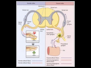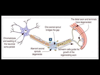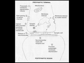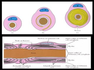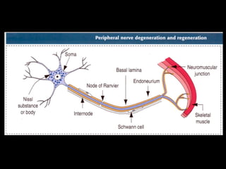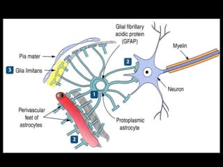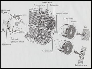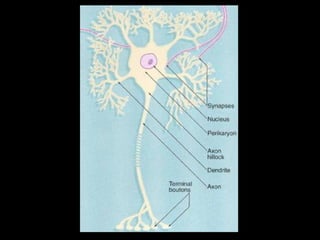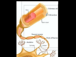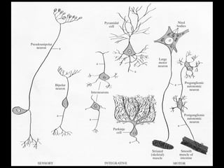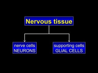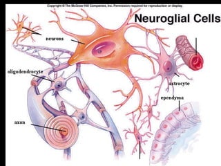 This document provides an overview of the nervous system, including its central and peripheral components. It describes the main cell types - neurons and glial cells. It discusses the key parts of neurons - dendrites, axons, axon hillock. It outlines the main types of neurons and glial cells in both the central and peripheral nervous systems. It provides details on how neurons communicate at synapses and how glial cells support neuronal function.